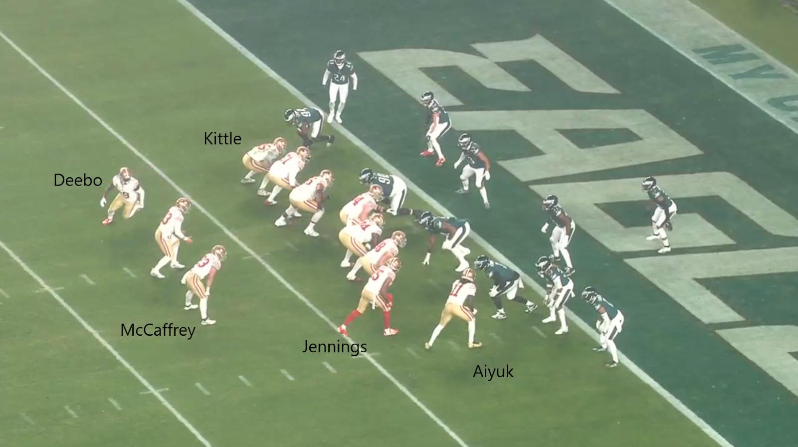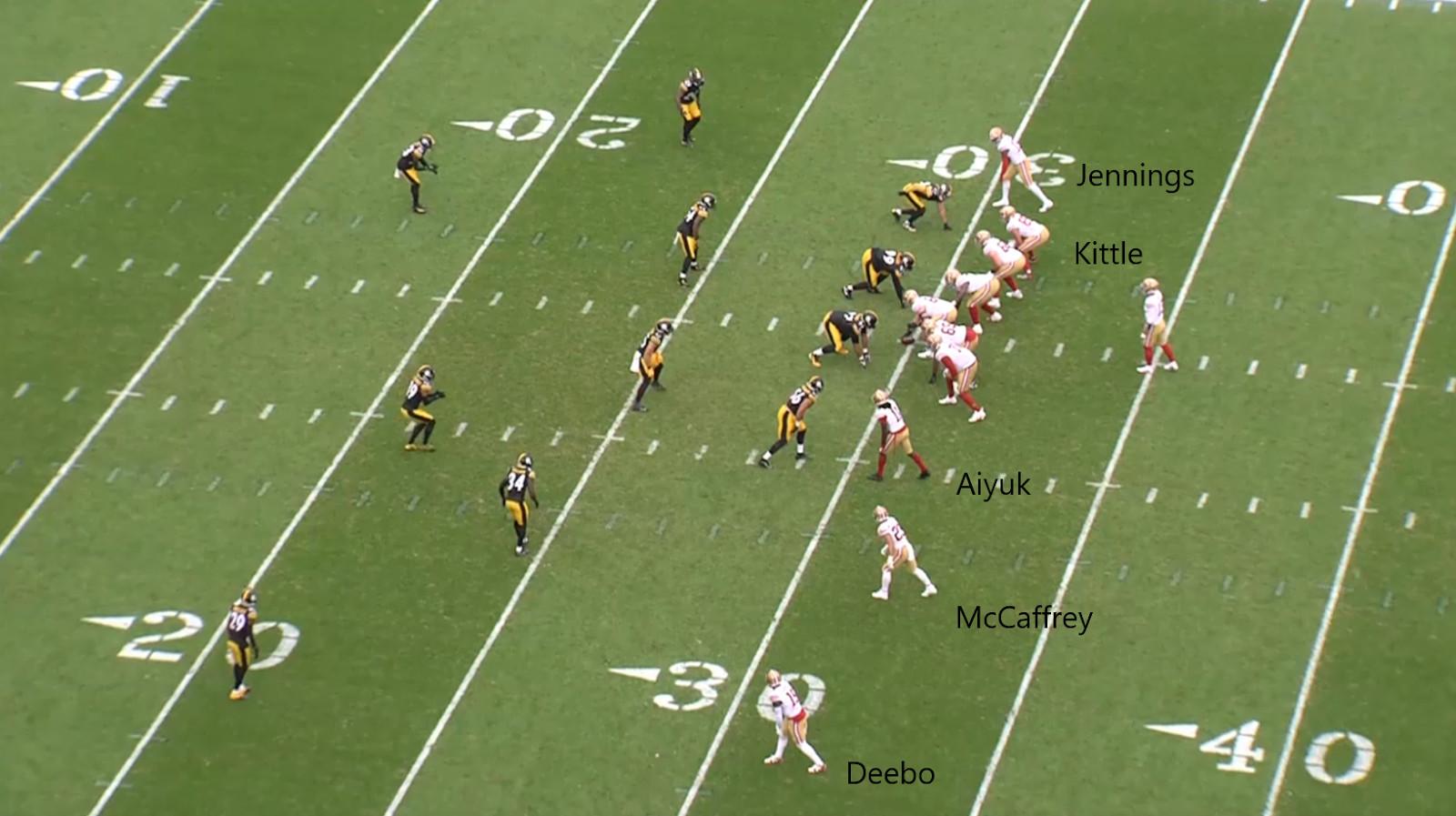 Not only does the offensive formation dictate who lines up where on defense—it also changes the call that was just given to the defense. Consider the 49ers offense. With their standard personnel on the field, they can line up in an empty formation …