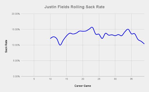 In his rookie season, Fields was worst in the league in sack rate—he took a sack on one out of every nine dropbacks, which is very rough. The following season? He was worst in the league again, with a sack on one of every seven dropbacks! An astonishing number.