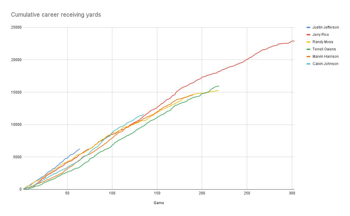 Obviously Jefferson has a long way to go. The sheer length of Jerry Rice’s line on this chart is mind boggling—but at least through four-plus seasons, Jefferson is on-pace to smash all these guys.