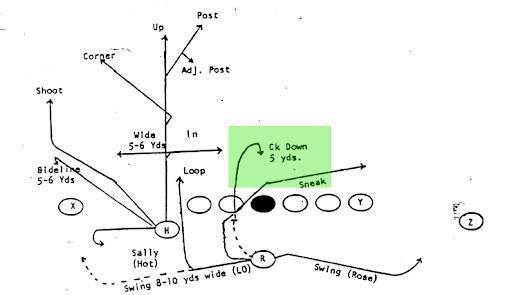 Before anything else, let’s establish what a “checkdown” is; while the term has become something of a catchall for any short pass, not all short throws are checkdowns. Checkdowns are built into plays as a last-resort option and are usually paired with a deeper passing concept. According to Merriam-Webster, the first known use of the term “checkdown” was in 1981. That’s around the same time that it started appearing in NFL playbooks. Here’s a diagram of a running back route tree from Joe Gibbs’s 1986 playbook with Washington: