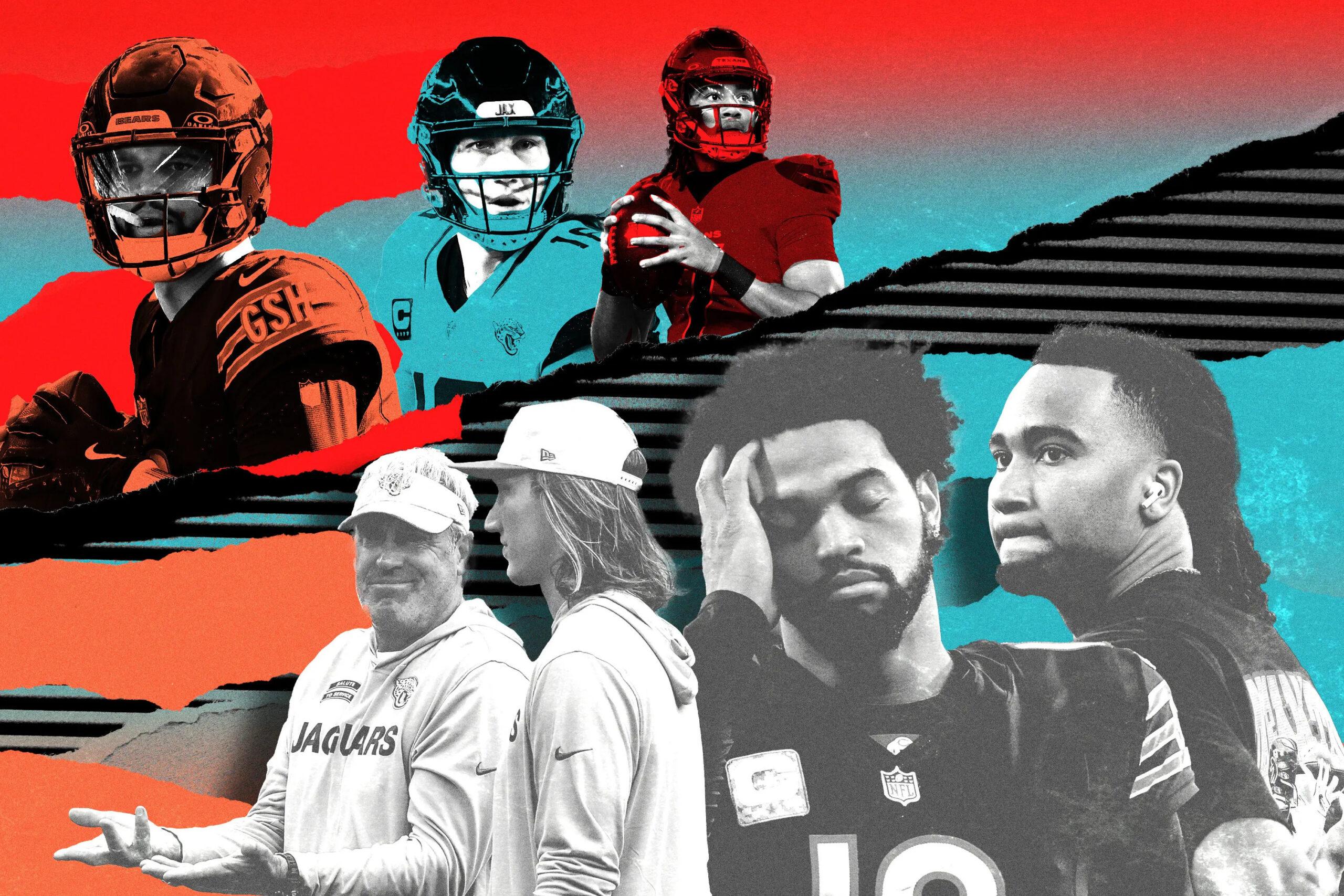 The quarterback billed as a generational prospect is off to a generationally disappointing start. But Williams isn’t the only young quarterback who’s failing to meet expectations. Look around the league, and you’ll find a number of those cases. Of the 15 quarterbacks drafted in the first round since 2021, eight have either been benched or lost their jobs permanently. The only two non-rookies in that group who haven’t been through such an ordeal are Trevor Lawrence and C.J. Stroud. All of Lawrence’s 2021 draft mates—Zach Wilson, Trey Lance, Justin Fields, and Mac Jones—are on their second teams. Kenny Pickett, the lone quarterback taken in the first round in 2022, is now a backup in Philadelphia. And Bryce Young and Anthony Richardson were both benched this season. Lawrence and Stroud are the success stories—but they aren’t exactly thriving either. Lawrence, a fourth-year pro, is 2-7 in his starts this season, and Stroud has been a below-average quarterback based on expected points added, success rate, QBR, and just about every other passing metric.