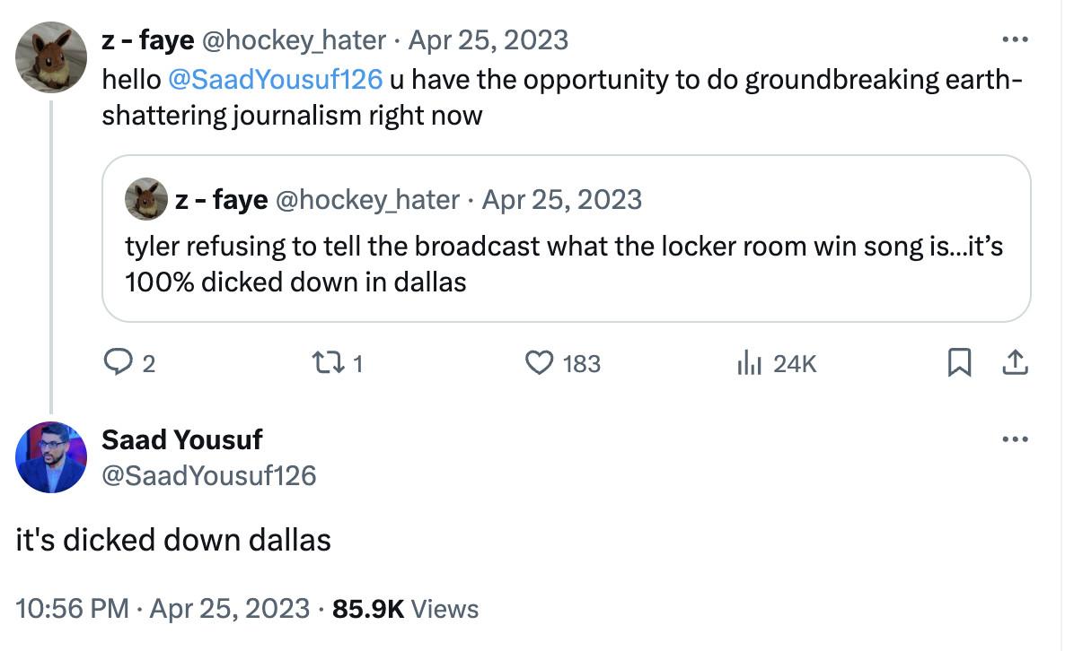 Anyway, with both the Dallas Stars and the Mavericks playing for a shot at the finals, the relevant song du jour is the Doublemint twins jingle, of course. But I regret (no, I don’t!) to inform you that while I was browsing some ideas for this section, I came across the following Twitter conversation from last season, presented without further commentary: