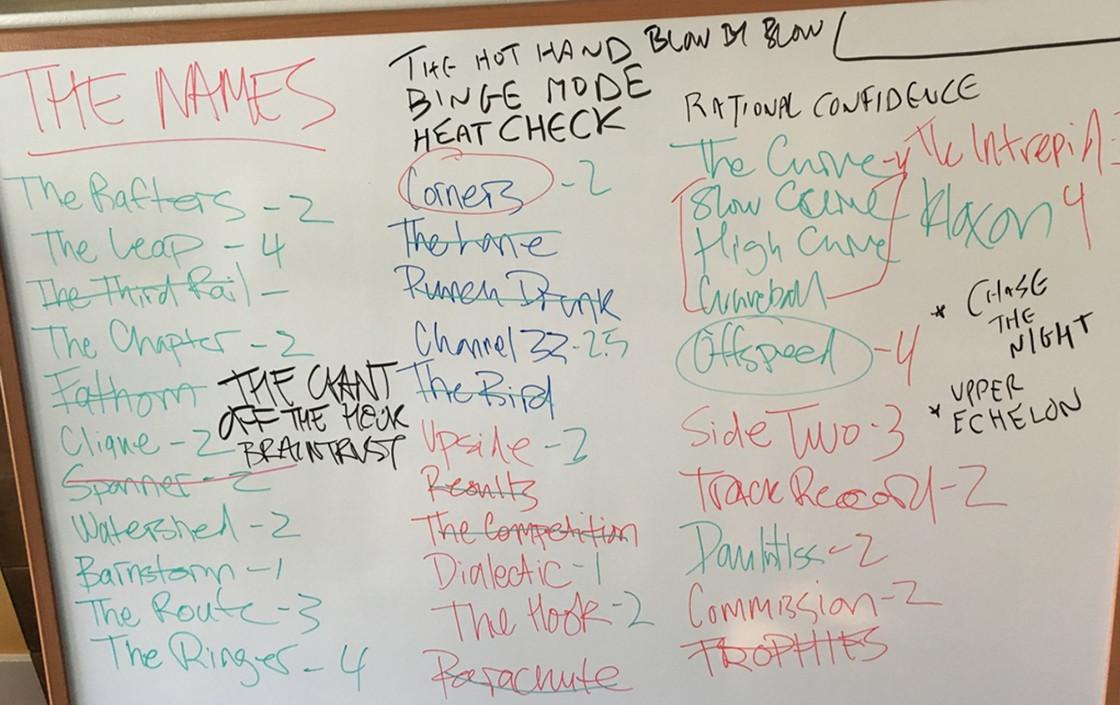 We wrote off “The Curve,” “Dauntless,” “Parachute,” “The Route,” “Corners,” “Fathom” and “The Hot Hand,” but left their letter corpses up on that board for black comedy’s sake. A few promising names, including “The Hook” and “Upside,” were already taken. I had two different late-night “revelations” — “Brainwreck” and “Binge Mode” — that bombed badly and became running jokes (especially after everyone found out that I own www.bingemode.com). As the days passed, the whiteboard paralyzed Juliet Litman and Mallory Rubin, and they stopped suggesting anything new. They just kept staring at the board with the Chris Christie “I Can’t Believe I Sold Out to Trump” Face going.