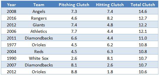 The Rangers beat the odds by being incredibly clutch. FanGraphs offers a stat called Clutch, which measures how much better or worse players and teams perform in high-leverage situations than they do overall. The Rangers were the second-clutchest team in the database, which goes back to 1974. Their Clutch score suggests that they won 13 extra games because their production came at opportune times.