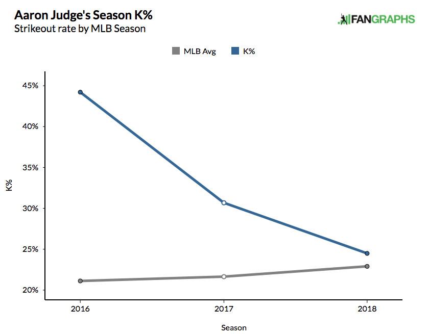 That shift represents a remarkable evolution for Judge, who struck out in an astounding 44.2 percent of his plate appearances in his rough 27-game debut in 2015, then posted the fourth-highest strikeout rate among qualified hitters (30.7 percent) last season. This year, though, he’s ahead of 49 others, at just 24.5 percent. Judge’s improvement is at odds with the leaguewide trend, which has seen strikeout totals continue to rise; now, he’s almost at the MLB average. Plus, only five qualified hitters have shrunk their strikeout rate by a greater amount than Judge from 2017 to 2018.