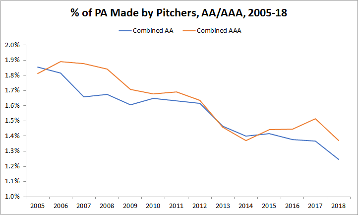 In the majors and high minors, these leaguewide declines in PA percentage are coming largely because pitchers are growing more specialized when they work on the mound: Teams are pulling starters earlier and using more relievers to get through their games, and one by-product of that trend is that pitchers hit for themselves less often. Even in the NL, many pitchers rarely hit, if ever; last year, 381 players pitched for NL teams, but only 240 made plate appearances as pitchers. If the game is already going in the direction of greater specialization by pitchers when pitching (and, by extension, fewer pitcher plate appearances), it seems silly to pretend that pitchers can still do the job of hitters, too.