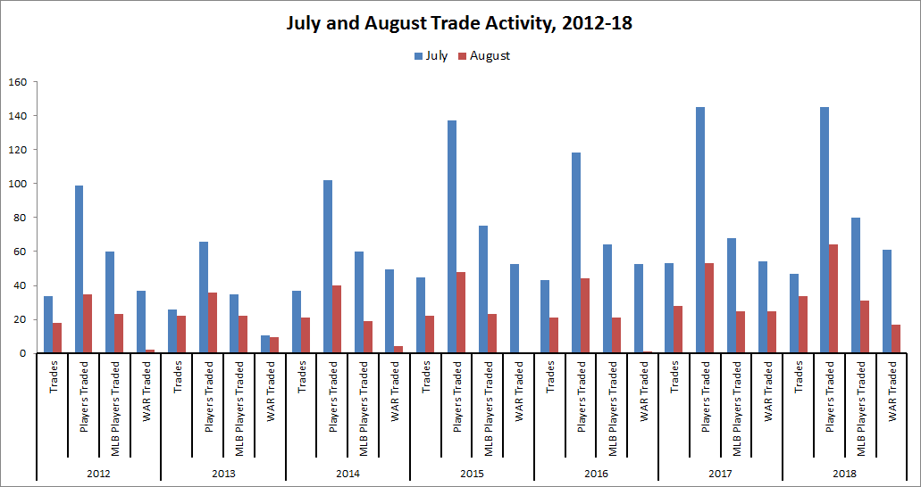 August was the third-most-active month for trade activity in that span, after July and December, accounting for roughly 14 percent of all trades. About 29 percent of all trades occurred in July, which means that August was almost half (47 percent) as active as July. The next graph displays not just the number of trades, but the total number of players (including minor leaguers, but not counting players to be named later) and MLB players exchanged in each July and August since 2012, plus the collective full-season WAR values of those players. August trades have tended to be depth moves more so than huge splashes, so the total full-season value of the players dealt in August has been about 19 percent of the corresponding full-season value of the players dealt in July.