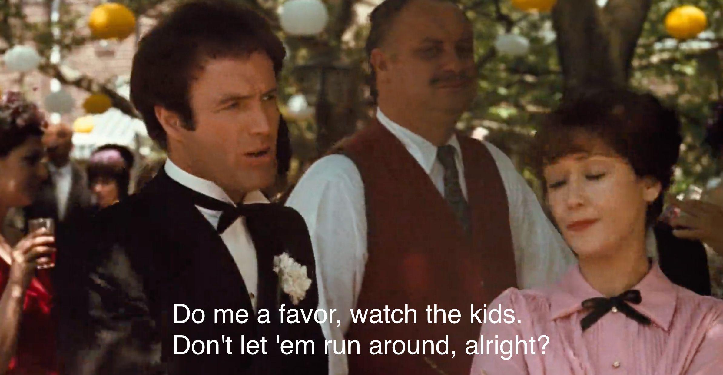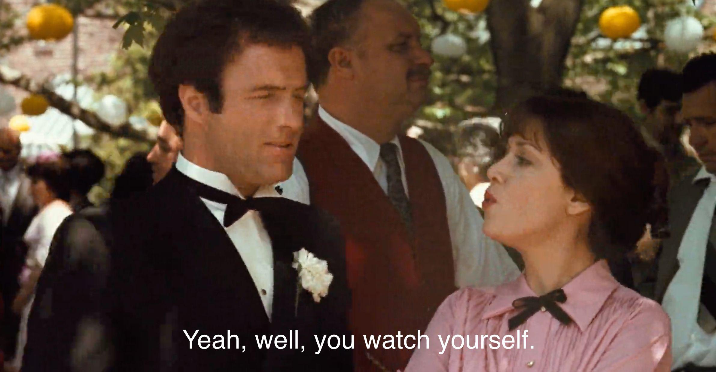 The drama: Where do I even begin?! Per Sicilian tradition, no man can deny a request on the day of his daughter’s wedding. And since Corleone is, let’s say, a man in high demand, there are a lot of people making requests. We’ve got contract killings being ordered, immigration deals going down; we’ve got the FBI jotting down license plate numbers in the driveway; photographers getting accosted left and right. This is the kind of action I’m looking for! 9/10