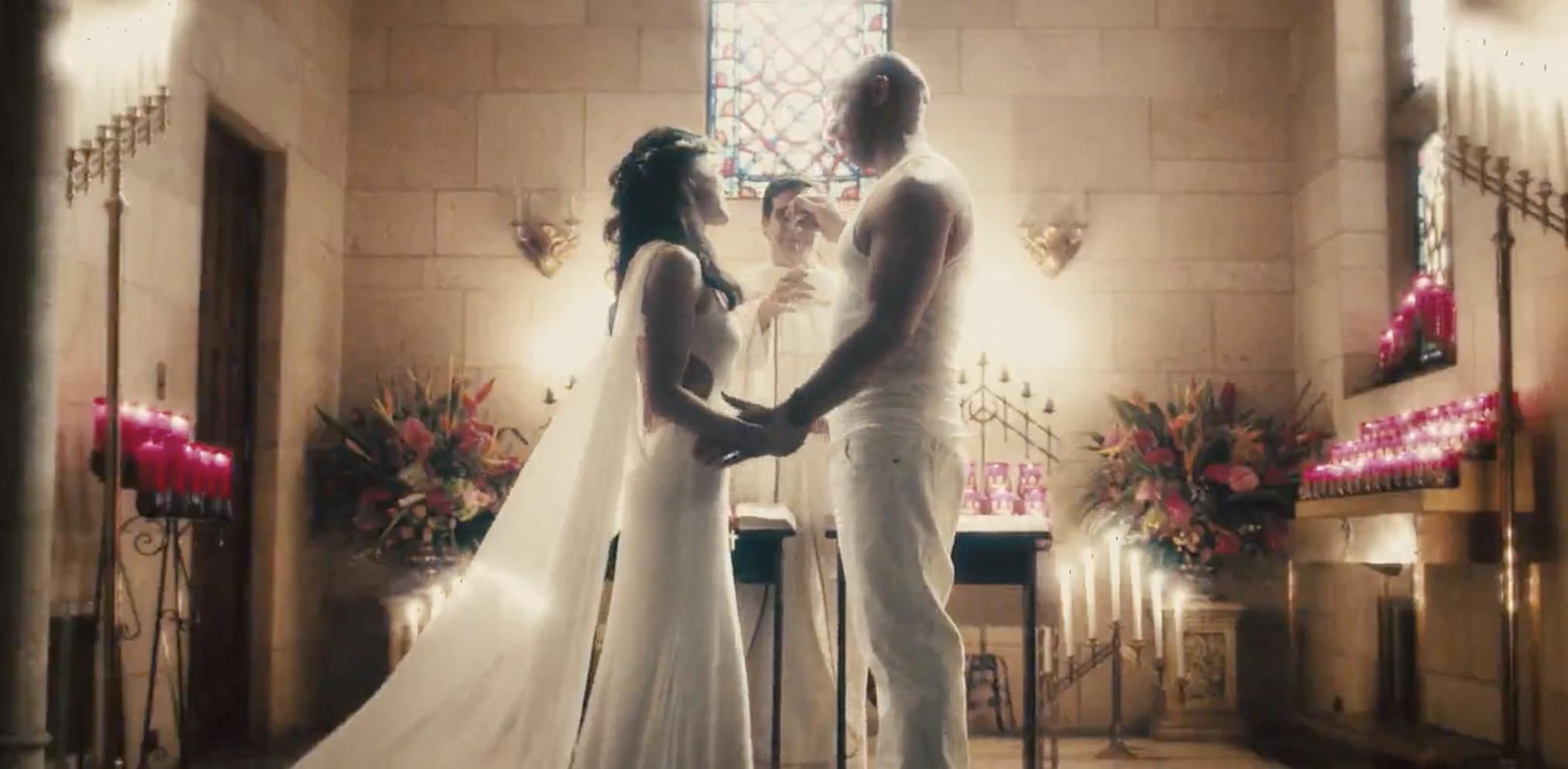 The preamble: To say Dom and Letty have been through a lot is an understatement. First of all, Letty DIED. Or rather, Dom thought she died. Actually, she survived her horrible crash, though she did lose all of her memories. Then a villain named Owen Shaw scooped her up and turned her into a bad guy. Then Dom and Letty bumped into each other in London and Dom was all like, “Derrr, Letty?” Then Letty shot him. But you don’t turn your back on family. Dom and the gang eventually rescued Letty from Shaw—which involved some absurd, physics-defying heroics. Then, after Dom almost dies from being crushed by thousands of pounds of concrete, Letty regains all of her memories—one of those memories being the night they got married.