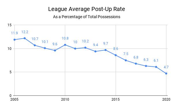 The post-up seems to have gone the way of the midrange jumper, squeezed out of the game by more analytically advantageous shots. In an average season, a possession that ends with a post-up yields about 86 points per 100 possessions; according to Synergy, no offense this season scores so inefficiently, even if you remove high-value transition plays and focus on half-court offense alone (because most post-ups come against set defenses).
