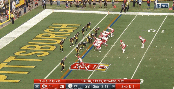 With his six TD passes in the Chiefs’ 42-37 win over the Steelers on Sunday, tacked on to the four he threw in last week’s win over the Chargers, Mahomes set an NFL record for touchdown throws (10) in a player’s first three games. Against Pittsburgh, Mahomes tossed more scores than incomplete passes (finishing 23-of-28) while racking up 326 yards. And the defense barely stood a chance. The deluge of rockets up the seam, perfectly timed back-shoulder throws, and on-the-move brilliance was unceasing. By the fourth quarter, most members of the Steelers defense looked like they just wanted to go home.