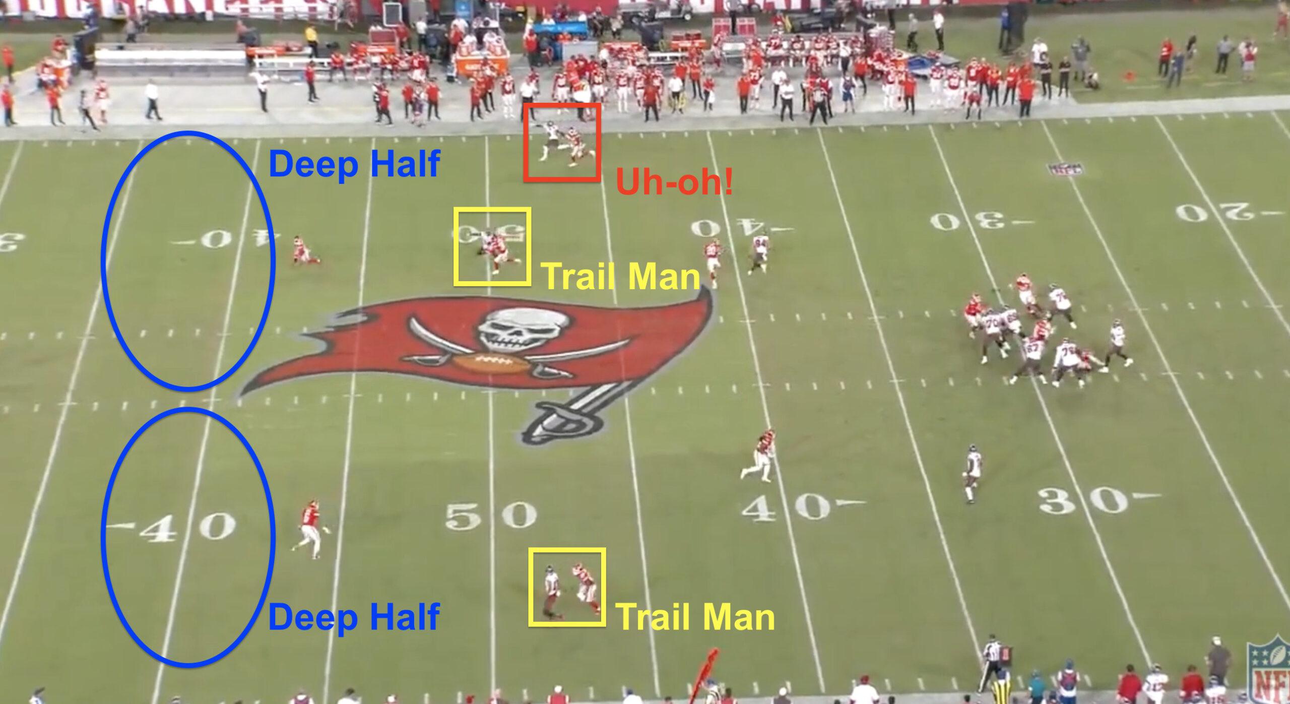 Once you establish the threat of the blitz, it comes time to bluff and bail into zone coverage. The Chiefs are well suited for this zone-blitz approach—again, Spags has historically had these calls available to him, and the Chiefs have shown them at times this year. Kansas City has been especially strong when playing with three safeties on the field, as they’ve rotated second-round rookie Bryan Cook onto the field with incumbent Juan Thornhill and free-agent addition Justin Reid. With three safeties, you can now play your Cover 2 zones while dropping a safety into an underneath zone, like the Tampa 2 hole. This can put a body directly on the intermediate route run by Knox, which makes it easier for the deep-half safety to stay on top of the big post from Davis.