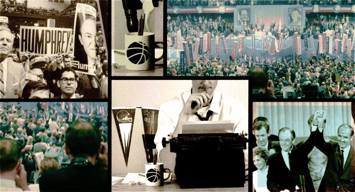 Inside the International Amphitheatre, Izenberg watched a Vietnam platform fight between hawks and doves, between state delegations aligned with different sides. A delegate from Oklahoma was accidentally hit in the head with the Missouri state flag. “For a brief second,” Izenberg wrote, “Hanoi was in far less danger than St. Louis.”