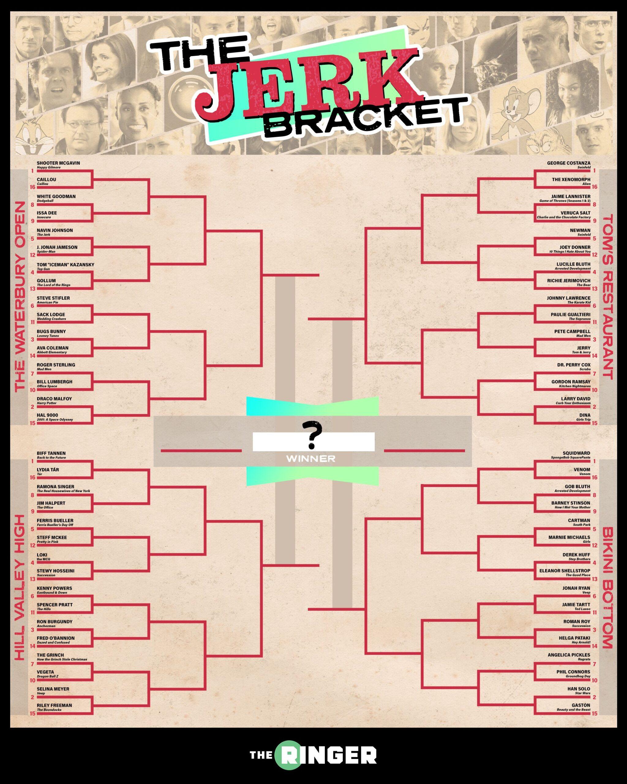 Because it’s high time we pay homage to an archetype with such a deep, rich, absurd history (and because it’s the end of summer and we’re a few weeks removed from Barbenheimer and there just isn’t that much to talk about right now), for the next week The Ringer will host a tournament of the greatest jerks in pop culture. (We’re honestly also doing this because jerk is just a funny word to say. Try it. “Jerk.” Isn’t that wonderful?) It shall be a celebration of the most beloved pains in the ass ever committed to film, and by Saturday, we—and you, the voter—will have crowned a top jerk.