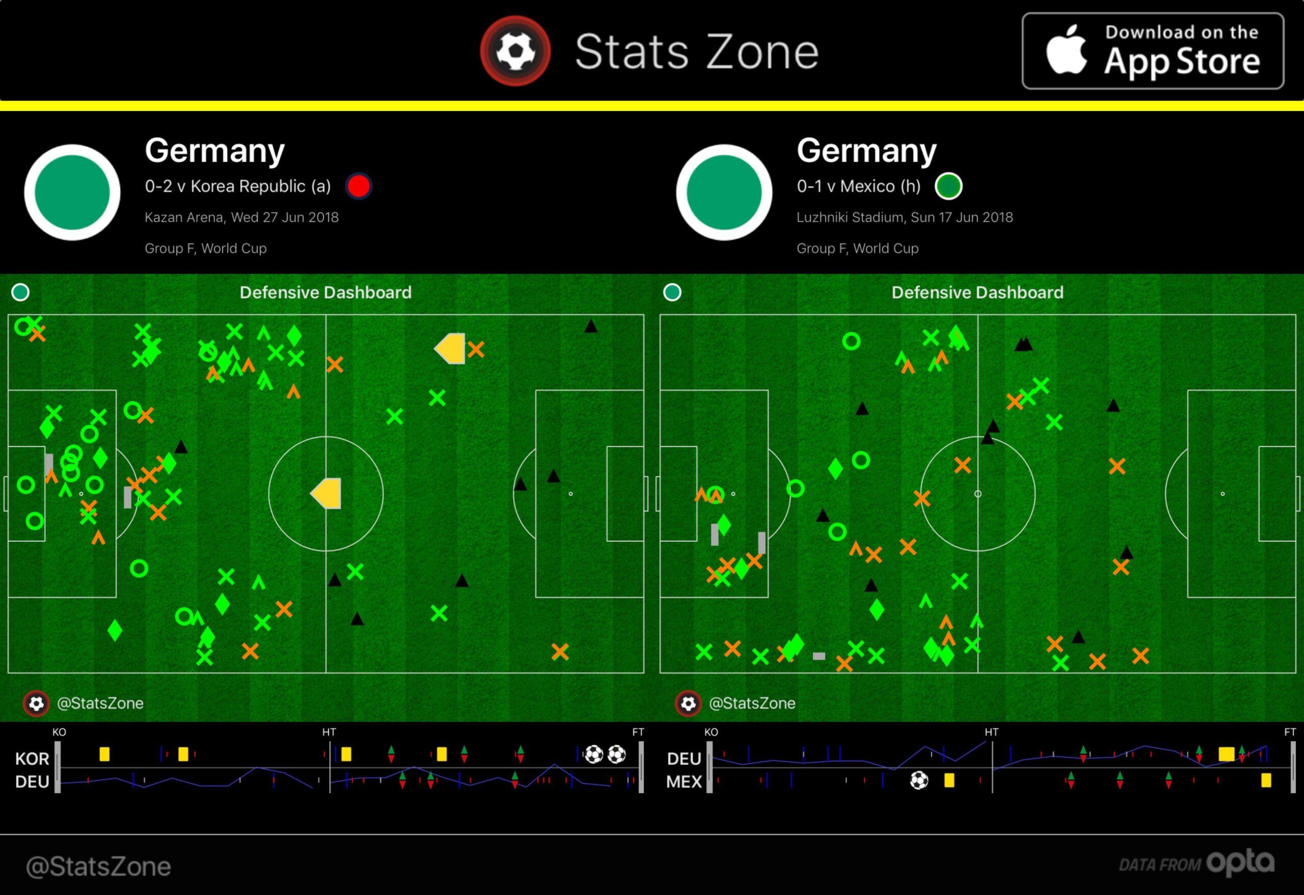 While the Germans were able to push all 11 players into the opposition half and possess the ball for most of their three games — they had over 65 percent of the ball in every match — it all fell apart as soon as there was a turnover. Check out the lack of defensive actions down the center of the field in both the Mexico and Korea matches. (An orange “x” marks a failed tackle.)