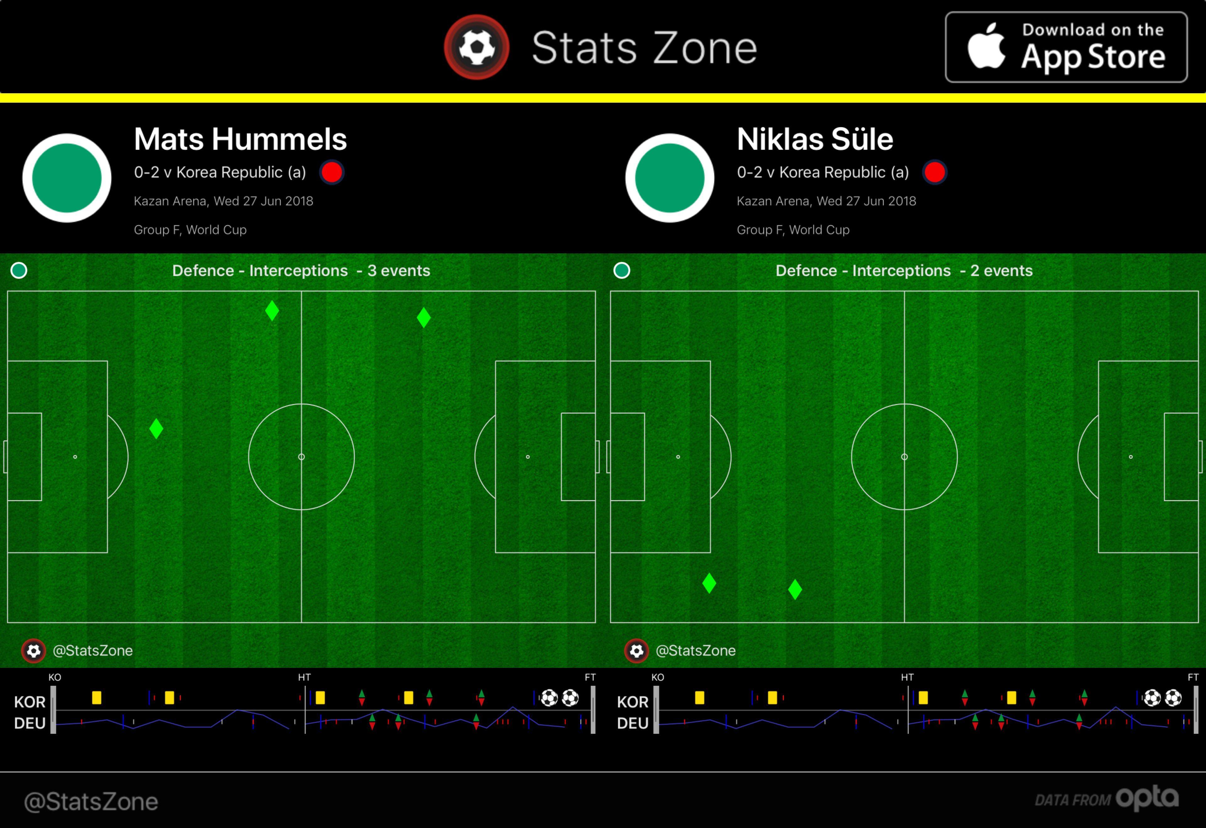 Germany allowed only 560 passes to be completed against them over the three games, while they averaged 581 completed passes … per game! But no matter who was partnering with Toni Kroos in midfield, the team lacked any transitional defensive presence whatsoever in each game. As a result, the center backs were often left to cover nearly half of the field by themselves. Against Korea, Mats Hummels and Niklas Süle were stretched so far apart: