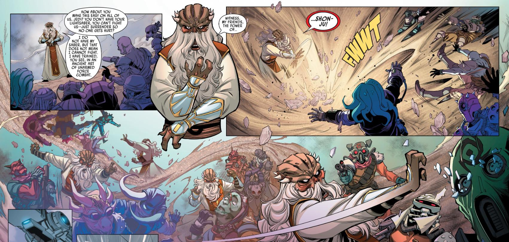 - A recent High Republic comic run, Shadows of Starlight, laid the groundwork for The Acolyte’s wuxia-inspired combat by canonizing a Force-infused, lightsaber-less fighting style called “Shon-Ju,” which was first mentioned in a now-decanonized Clone Wars comic from 2010. In the panels below, Jedi Grand Master Pra-Tre Veter demonstrates the technique. It doesn’t keep him out of enemy hands, but at least he has his hands free when he’s captured.