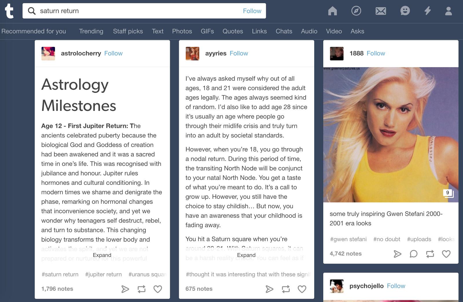 The teen astrologists I spoke to said that Tumblr’s horoscope-obsessed community began to form around 2011 or so, and was bolstered by a tagging system that made it particularly easy to discover in-depth posts on niche topics.