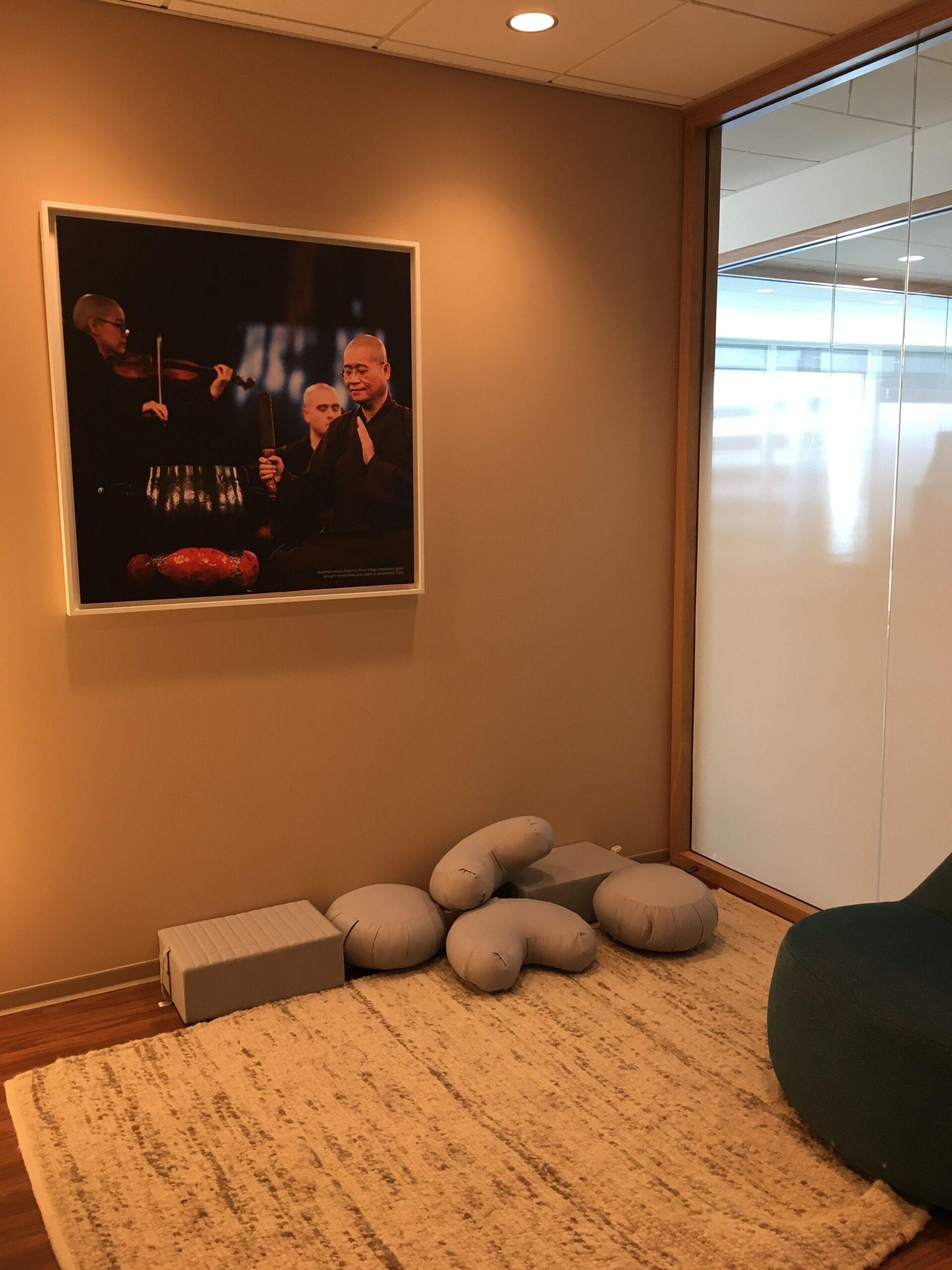 There’s a meditation room on every floor, designed under the consultation of French monks, complete with plush pillows and a tablet that issues breathing directions in a soothing female voice. A custom-built ventilation system pumps fresh air throughout the building, which the company says improves cognitive functions. A communal lounge and kitchen area offers coffee and snacks, but not the typical kegs and bar carts that are tech company staples. “We do not serve alcohol here. Did you see any?” Pinkham asks. I shake my head. “OK, good.”