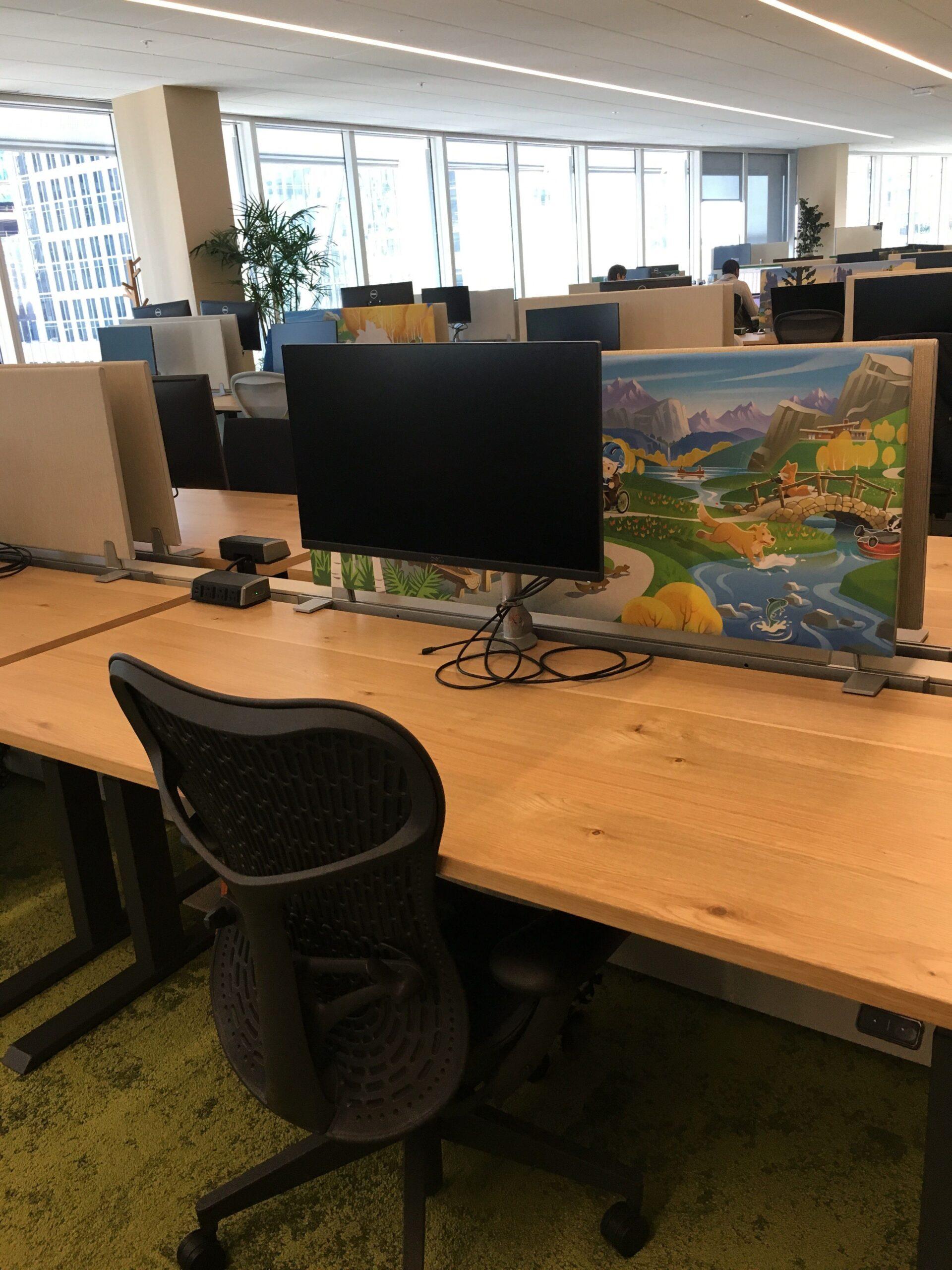 In a typical redesigned Salesforce office, a foyer near the elevator bank is lined with massive photos of the company’s various charitable deeds. Beyond the foyer, rows and rows of pristine desks and PCs sit largely empty. Instead of assigning employees seats, Salesforce assigns them floors and allows them to float from one area to another as they see fit. At night, workers clean all the desks, so that each morning brings another uncluttered experience, like a freshly wiped iPhone. The only items employees will find at their desk every day are an illustration of Salesforce’s various cartoon mascots frolicking in nature and a backpack filled with three days’ worth of food and water, in case an earthquake upends civilization.
