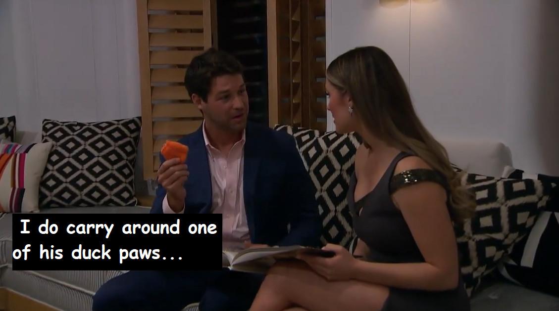 Are your ears ringing yet? Because, reader, I gasped. Of Rachel and Gabby together, Hayden says, “I’ve been comparing my ex to, like, this [bleep], right? They don’t hold a candle to her, and I don’t want to just settle. I can tell you right now, I don’t see how any guy here could be like, I’m fucking marrying these girls.” And the editing is definitely a little wonky on that bleeped bit, but there’s nothing to suggest that Hayden wouldn’t have said something awful there. It is so, so disgusting. But if Hayden is going to score that FabFitFun sponsorship, he does need to stay on camera for as long as possible, so before the cocktail party he says: “My main goal now is to get that rose from Rachel, and I have something that will take our relationship to another level.” And I kid you not, that “something,” is …