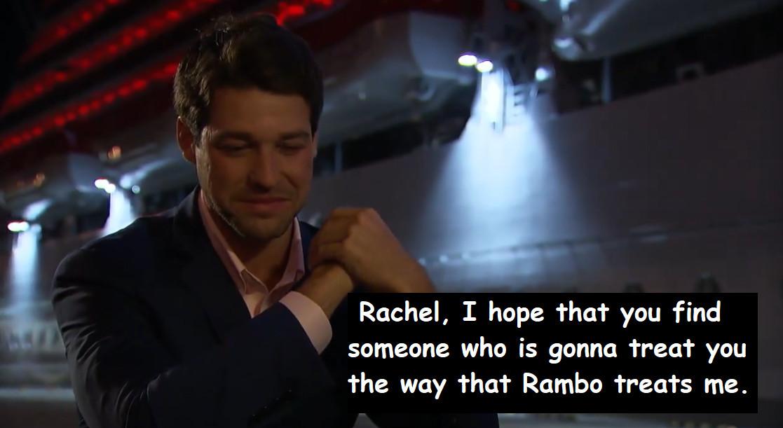 I truly loved this moment from Rachel, and I loved her marching Hayden off this cruise ship’s gigantic plank even more. Outside, on the dock of shame, Hayden draws up every bit of liquid inside his body to squeeze out a few tears for the performance of a lifetime when he declares: “I wanted this to work, but … I want Rambo more.”