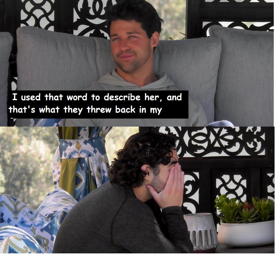 But we can be sure that it happened because Hayden is positively sulking around the Bachelor mansion before the men head to France, telling anyone who will listen that he didn’t do anything wrong, the women overreacted to his comments, and that Gabby called herself rough around the edges. So of course, he went ahead and weaponized her biggest insecurity against her in order to reject her. Just like any normal guy would do …