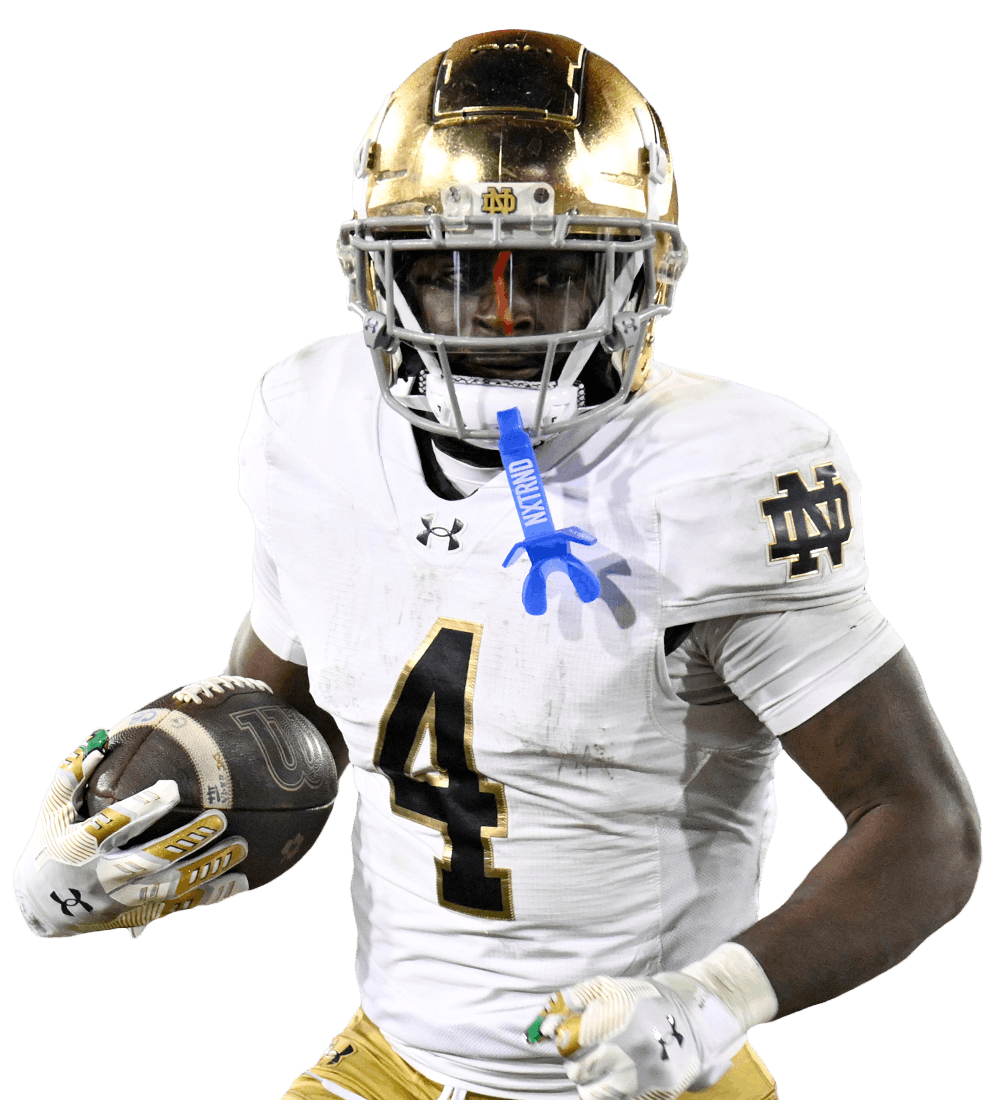 The ball can drift from his frame, but he got 504 touches and fumbled just once at Notre Dame. He’s built well, but a knee injury slowed him down late in the 2024 season, and he doesn’t have elite size. He leaves his feet and tries to hurdle defenders a little too often.