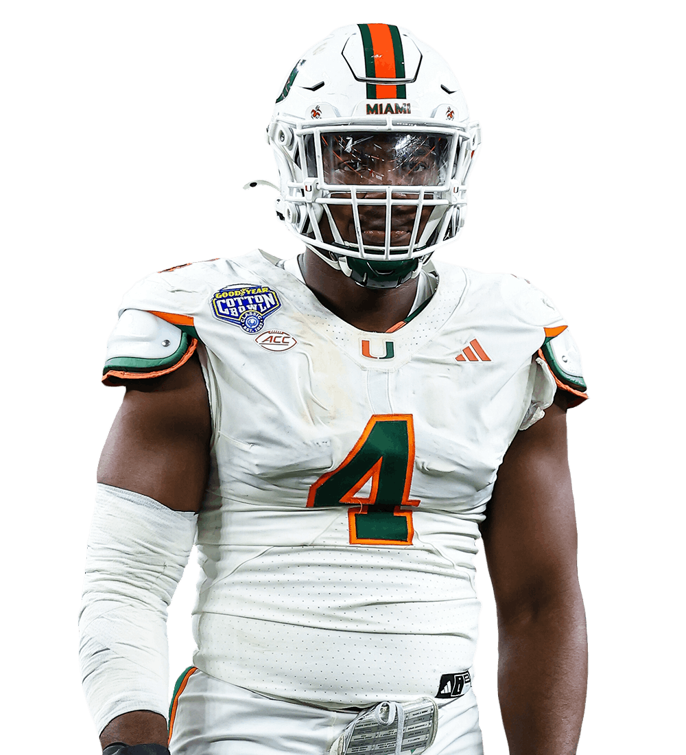 Bain is a thickly built, power-based edge rusher with violent hands who’s an elite run defender and a highly disruptive pass rusher. He racked up 54 tackles, 15.5 TFL, and 9.5 sacks along with a forced fumble and an INT in 2025 and really peaked during the Hurricanes’ run to the CFP championship game.