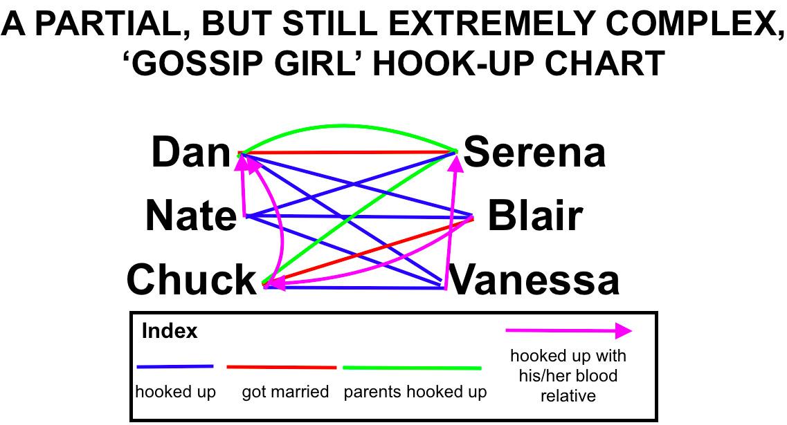 (You’ll notice that the only two characters not linked to each other are Chuck and Serena. I didn’t feel comfortable saying they “hooked up,” because Chuck sexually assaulting Serena in the show’s pilot episode — a moment that, oddly, is glossed over for the rest of the series — doesn’t count as a “hook-up.”)