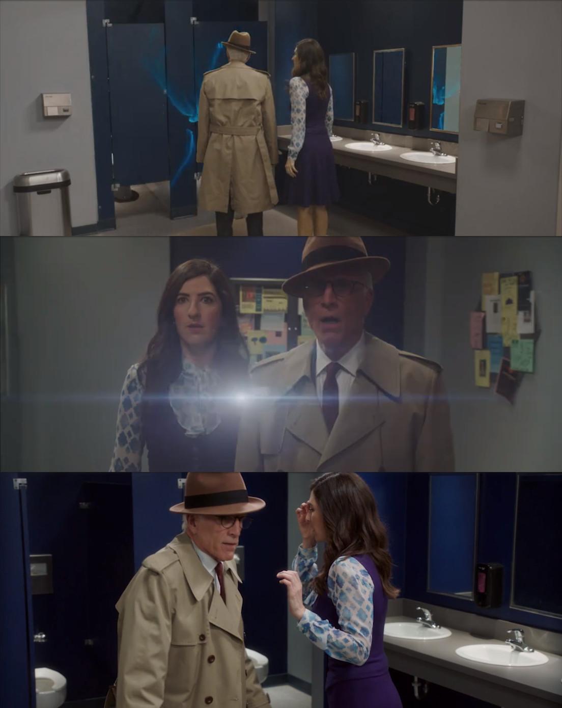 Most Wanton Disregard for Bathroom Etiquette: In this three-shot sequence from the first scene of the episode, two closed toilet-stall doors instantaneously open: