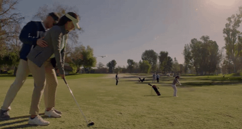 Abby suggests that it’ll take too long to fly to a regular airport and asks if he can pull off an emergency landing somewhere. Naturally, there’s a golf course just below where the plane is hovering. Try to imagine for a second what this experience would be like for a golfer on the ground just trying to get in a quick nine before lunch.