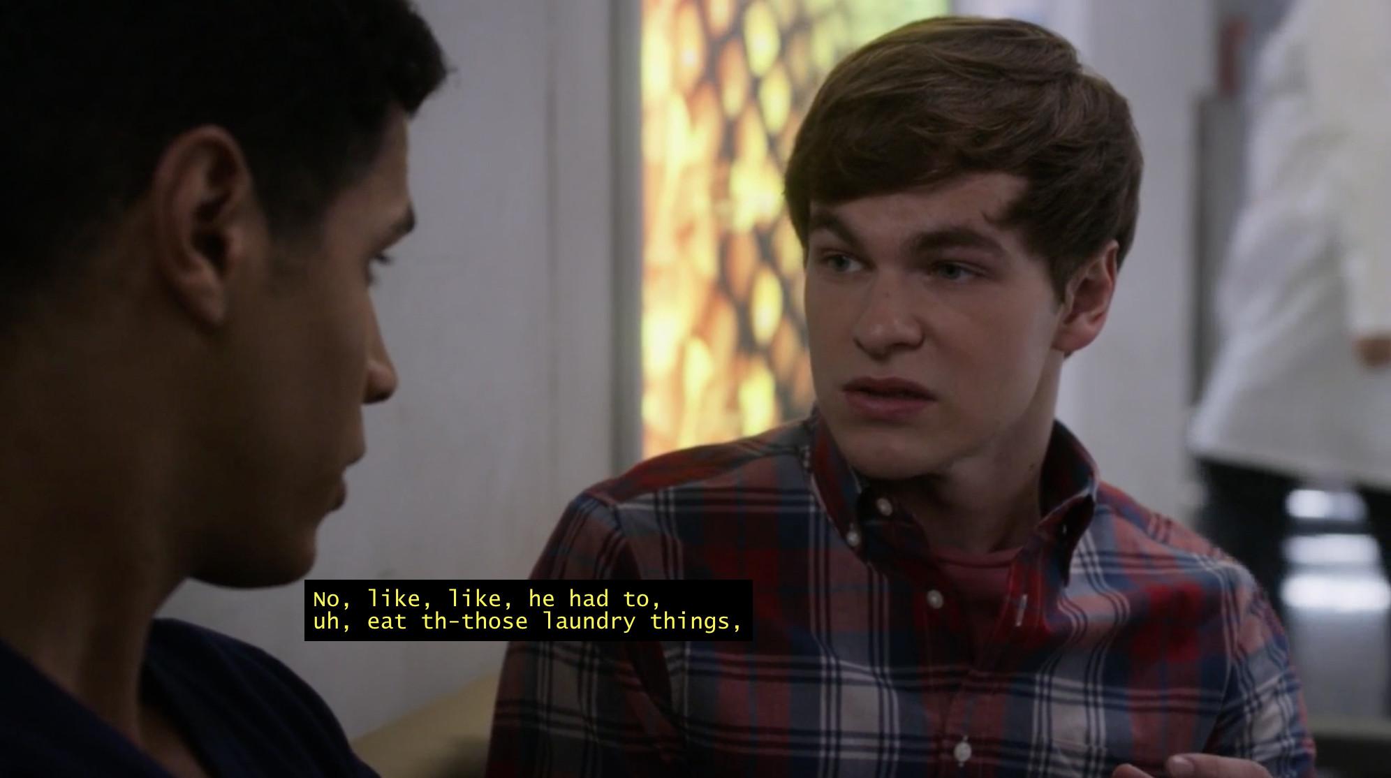Thankfully, Caden’s concerned frat buddy Blake (also a good frat name) filled in the details. There was a “Wheel of Torture” at the frat house for the pledges, and Caden landed on “laundry.” As in, he had to do laundry for the entire frat house?, surgeon Jared (Chuku Modu) asked.