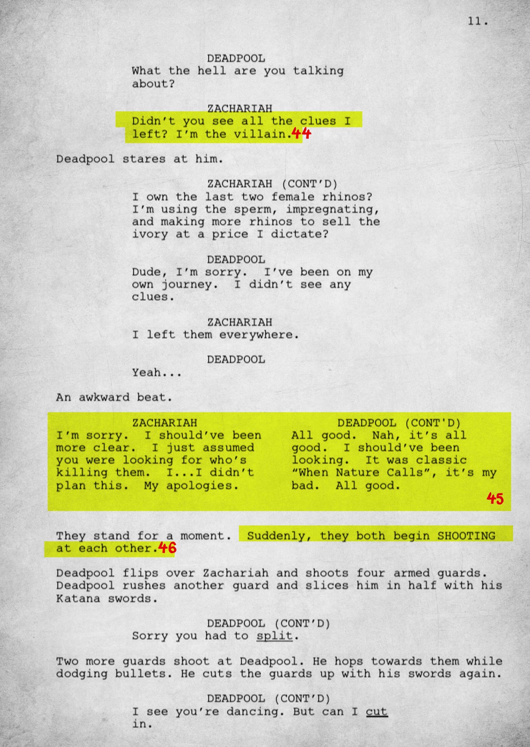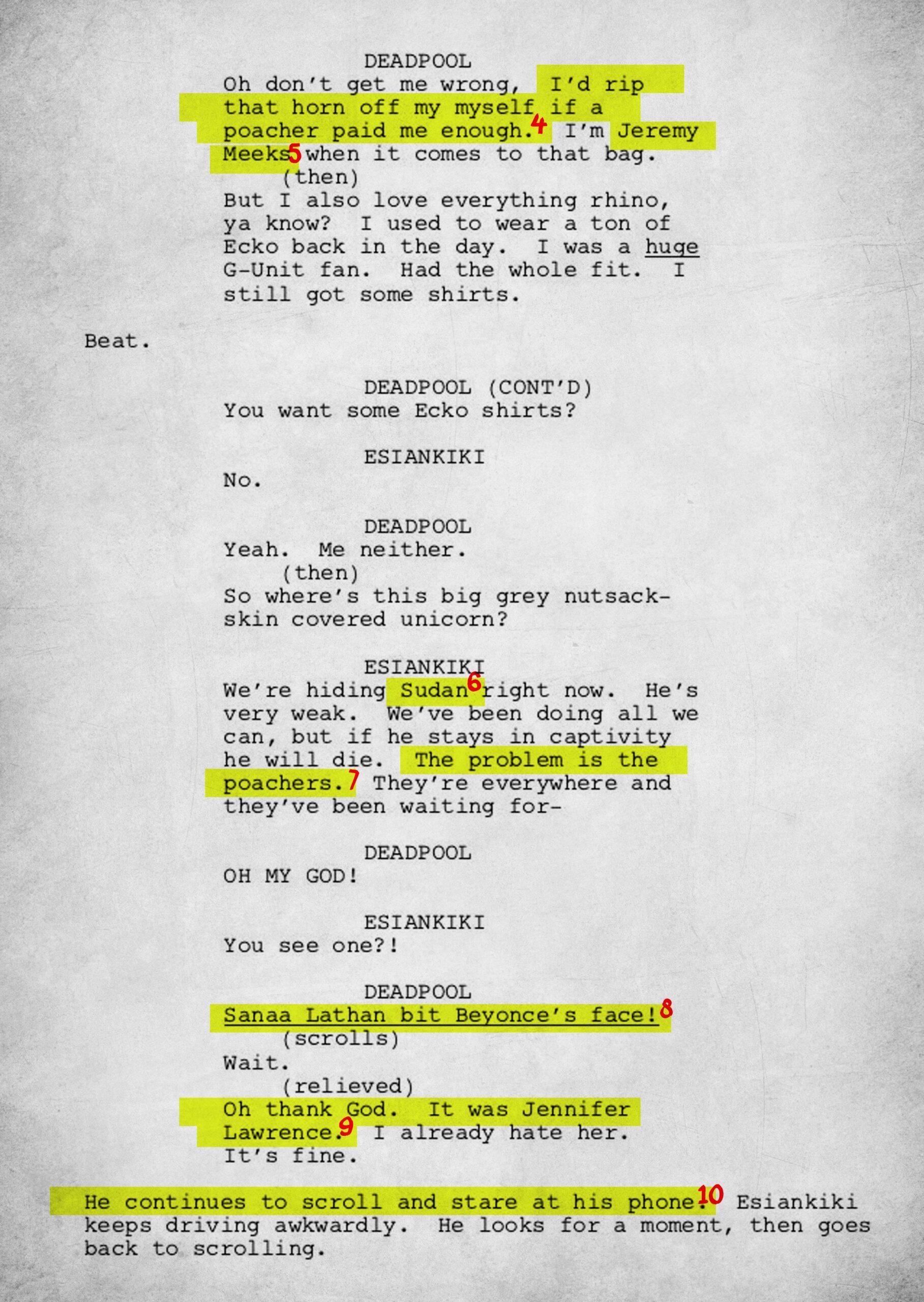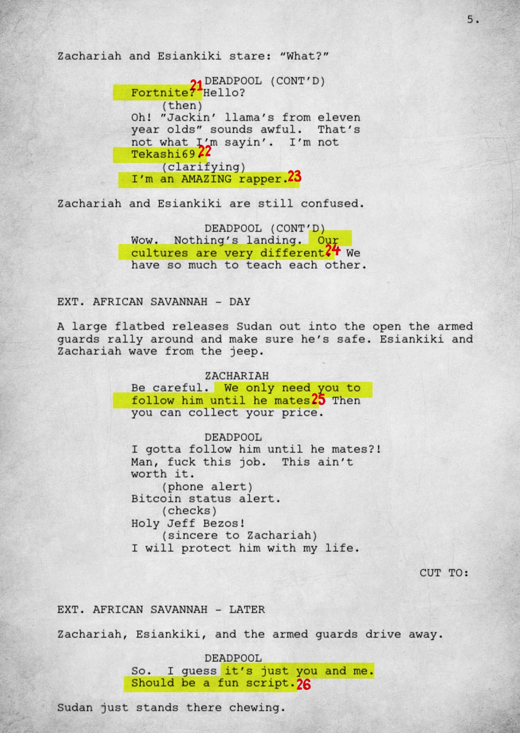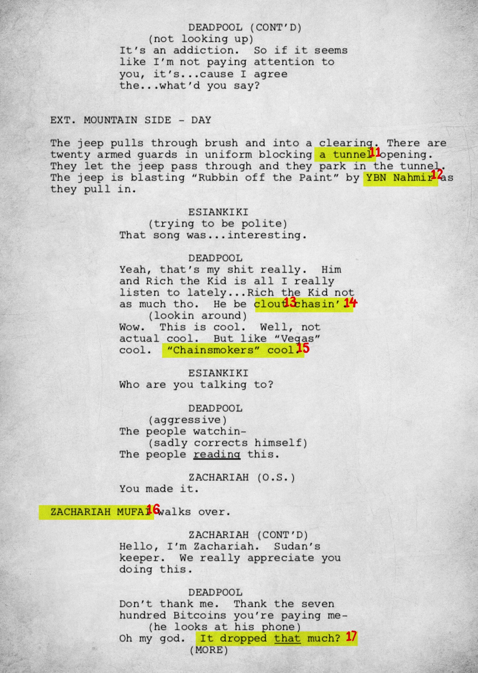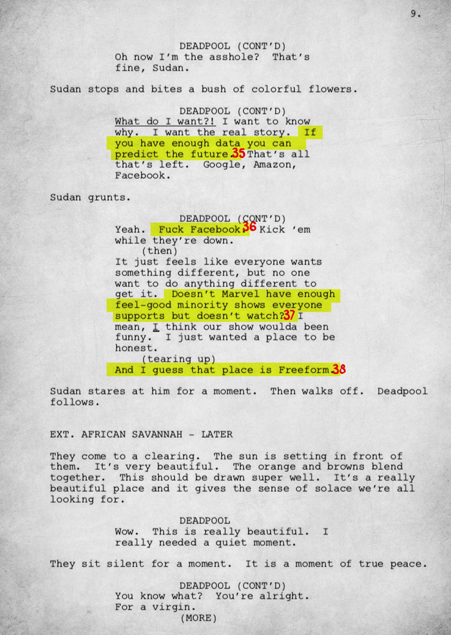 The 15-page script is rife with meta and pop culture references. To fully understand the work, we have annotated each page.