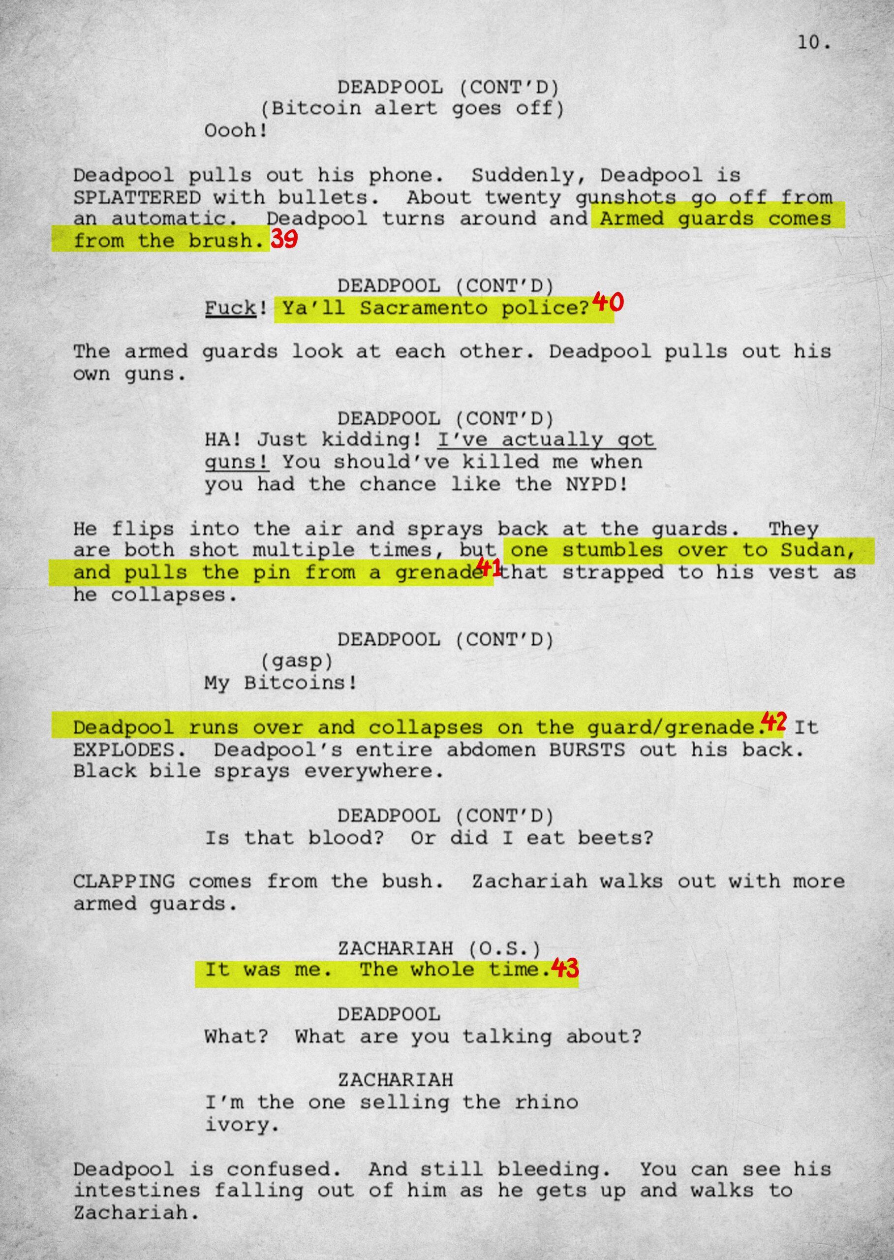 39. “Armed guards come from the brush”: There was a hostile takeover of Deadpool.