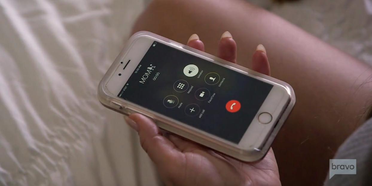 Shortly after, Brittany calls her mom. Brittany often eschews a phone case, but on this occasion, she opted for this clear one. Her device is crack-free and rose gold; clearly she is better able to care for her iPhone and isn’t prone to outbursts in which she hurls it against a wall. Her mom is in her phone as “MOM” in all caps followed by a poodle emoji. (The screenshot below is from a later scene but offers a clearer view of the poodle.) Adorable.