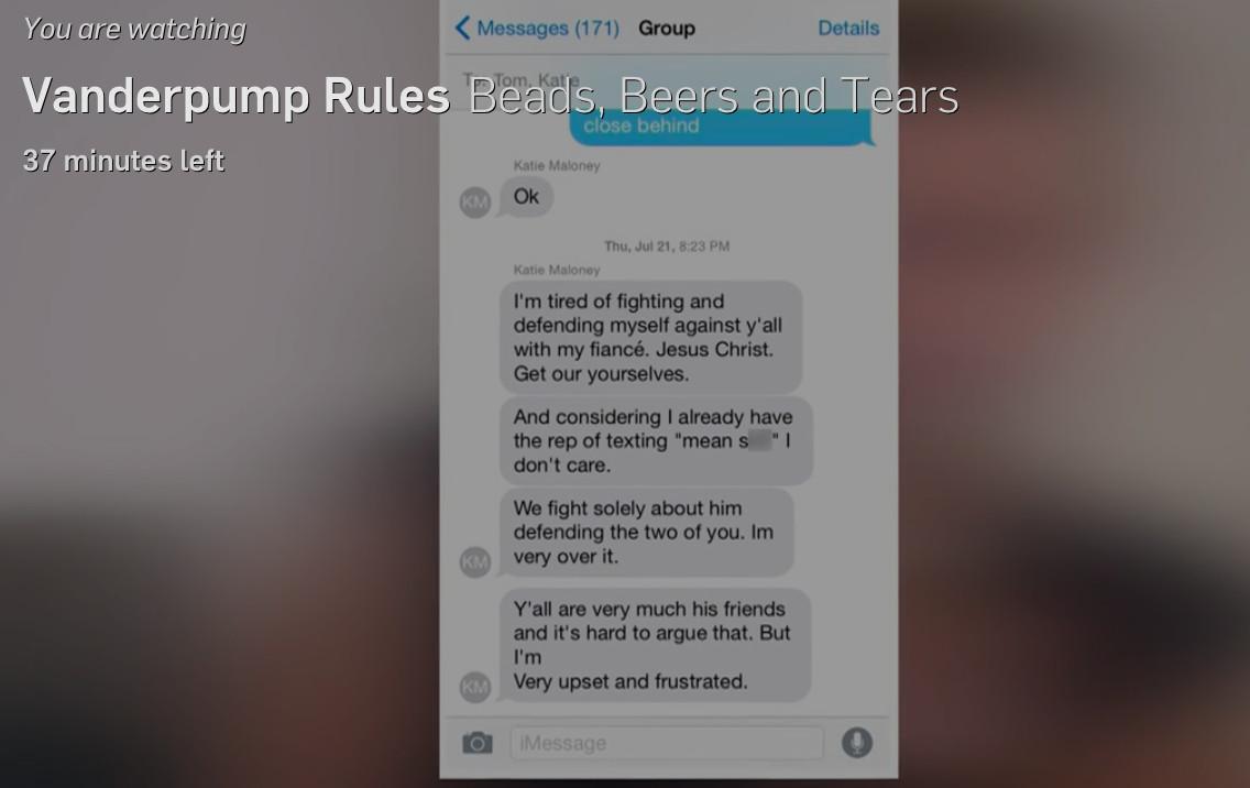 It’s really unfair when the show displays close-ups of Katie’s texts but eliminates most of whatever the recipient sent her. No one on this show is innocent, and some of Katie’s rage-texting is not without cause. Her now-husband once hooked up with a girl in Vegas, a fact that came to light only because Kristen (who functions as the show’s amateur internet detective; she admits to using location-sharing to track her boyfriend, Carter) snooped through Jax’s phone in Season 4 and found some texts about Tom she wasn’t supposed to. Nearly every major story arc on this show has its roots in a text message.