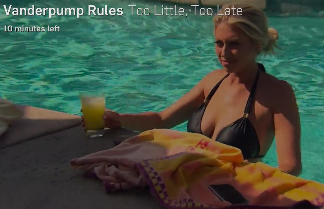 No one has ever successfully worked poolside. You can’t even see your screen. To wit, Stassi eventually ambles over to an awning, where she orders another drink to complete her story in the shade.