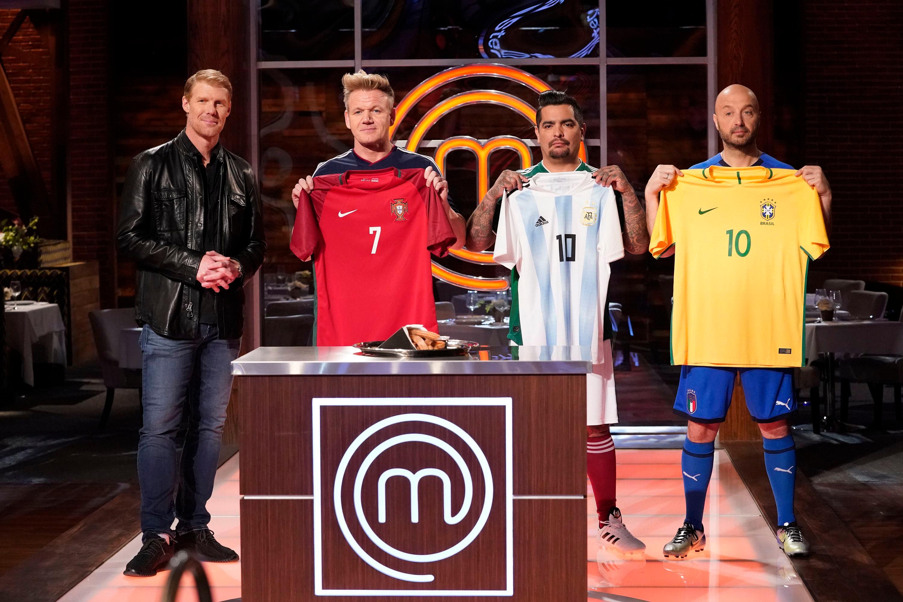 When I first saw this photo, I assumed the judges would also be wearing Ronaldo, Messi, and Neymar jerseys, but apparently they only held those up for the promo. Instead, in the actual episode they wore kits of their native countries: Scotland for Ramsay, Mexico for Sánchez, and—guess who?—beloved Italy for Bastianich. They all looked absurd.
