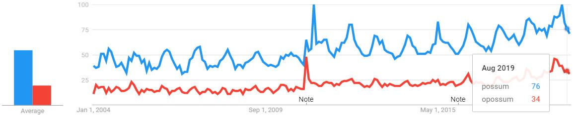 Lately, though, opossum has finally fallen behind. I can’t tell you which word is more common in Albuquerque, but Jesse would be happy to hear that on the internet, possum easily outpaces opossum.