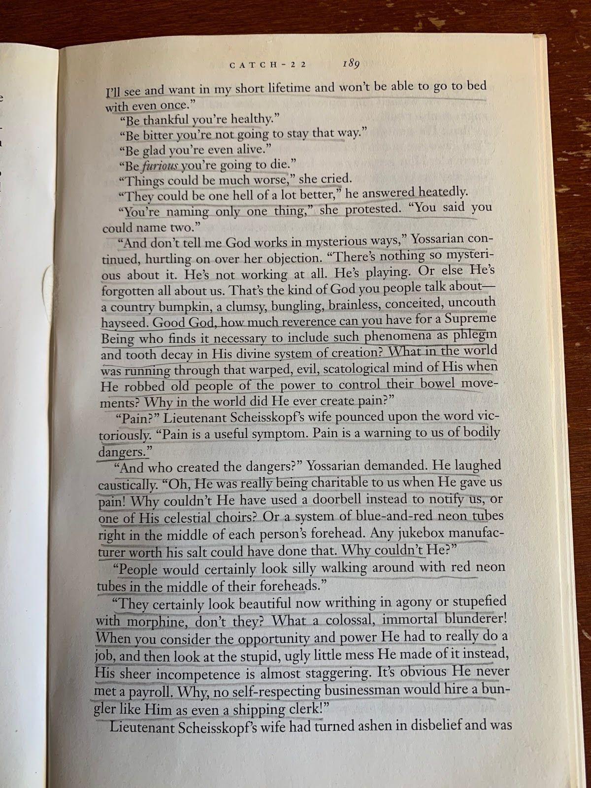 This is the argument midway through the novel in which our hero, an angry U.S. Army Air Force bombardier named Yossarian, dismisses the argument that God works in mysterious ways. “There’s nothing so mysterious about it,” he insists. “He’s not working at all. He’s playing. Or else He’s forgotten all about us. That’s the kind of God you people talk about—a country bumpkin, a clumsy, bungling, brainless, conceited, uncouth hayseed.” In high school, I took the liberty of underlining every single line on that page except one. Look at how extra this is.