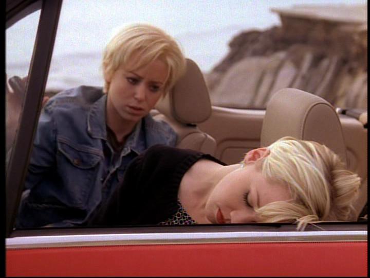 Donna’s worst suspicions were confirmed when she caught her boyfriend in a limo half-naked with Ariel (Kari Wuhrer), the trampy record label A&R rep. Cut to a shot of the condom wrapper on the floor. (I’m not just saying this—90210 literally cut to a shot of a condom wrapper on a floor.)