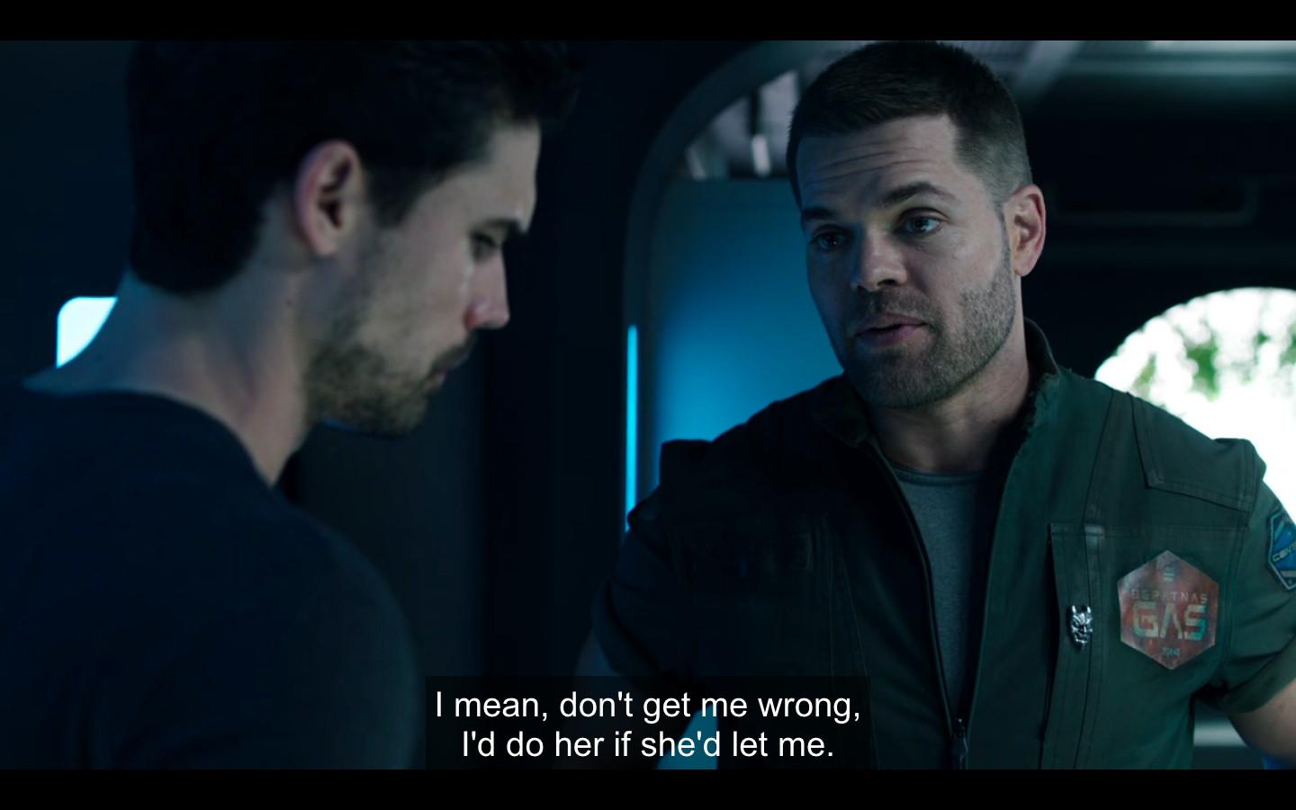 As myriad YouTube tributes have proved, you can frame Amos as an exclusively ultra-dark character, with grim hints of a child-sex-trafficking past neither the show nor the books have delved into long enough or deep enough to feel exploitative. (If Season 5 follows the books, we’ll follow him back to Baltimore, where he will grapple with what Chatham has described as his character’s “mother-figure-plus-lover situation that he had. It can get a little weird.”) There is something entirely inappropriate about Amos, as both a living human and a narrative device. One of his funniest early moments, in which he describes Naomi to Holden (who is Naomi’s boyfriend) as “like a sister to me,” concludes as follows: