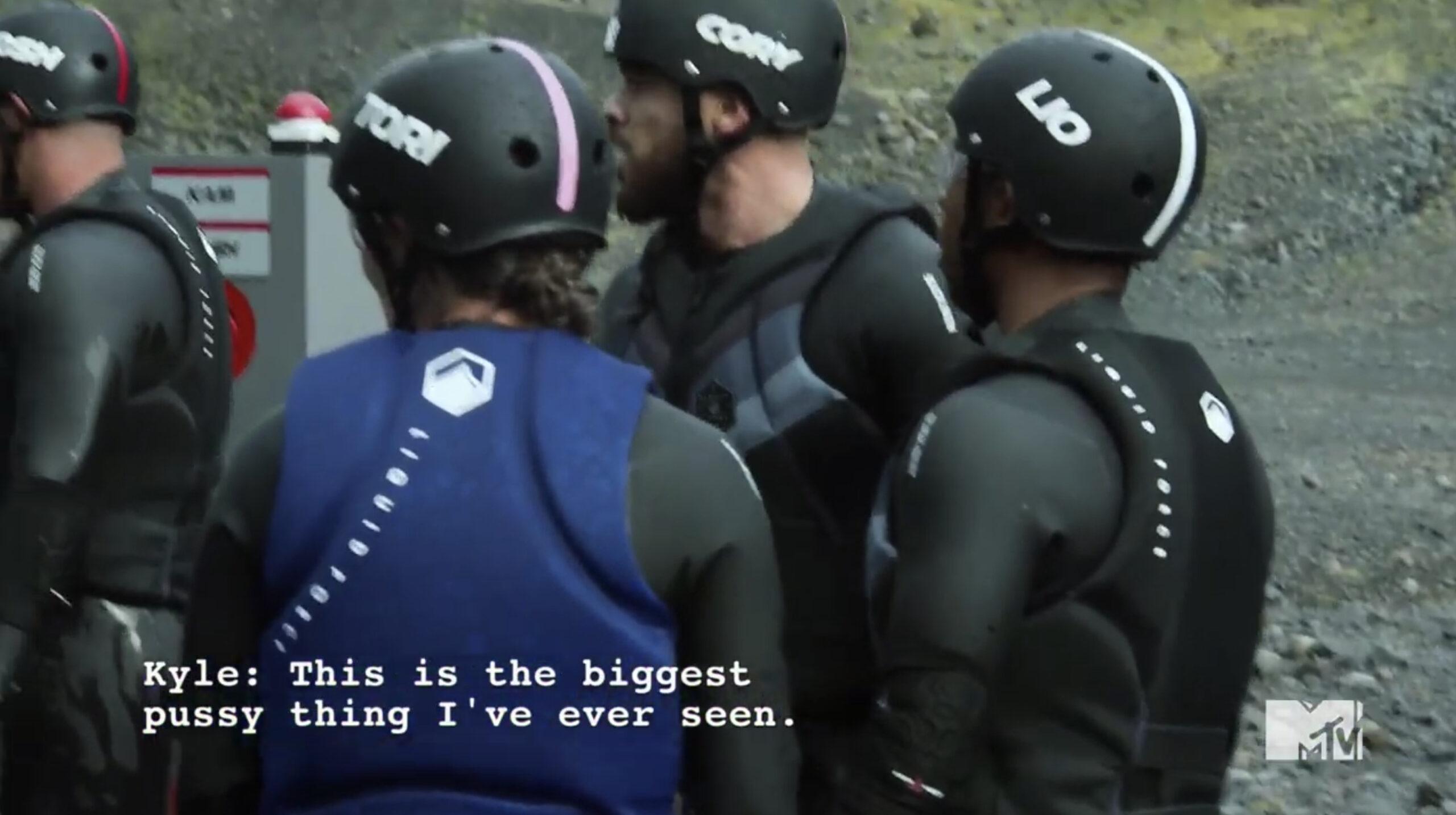 I would like to clear something up. Throughout this episode, several people—namely Kyle’s own partner, Nany—slag Kyle off, claiming that he’s just on the show to fuck around and that he doesn’t want to win. (“Slag” is a British term that I am using out of respect to my friend Kyle.) And while I know that he: (a) changed his face through plastic surgery, (b) has back tattoos that rival Ben Affleck, and (c) has a very silly accent, I can’t stand this disrespect. In six Challenges he’s made two finals, won three eliminations, and proved that he’s one of the better politicians on the show, and more of a physical threat than you’d think. If he had the gift of size, he would’ve won at least two Challenges by now.