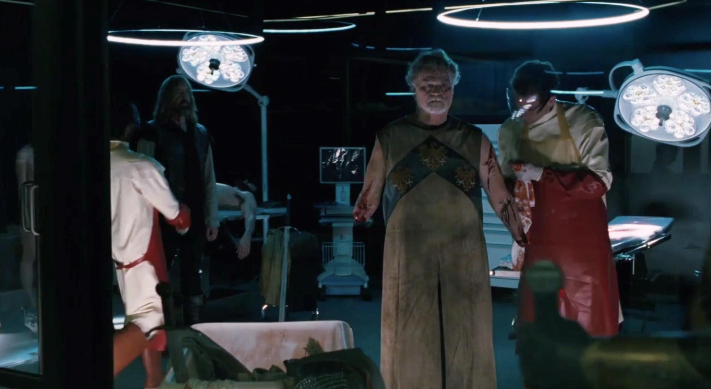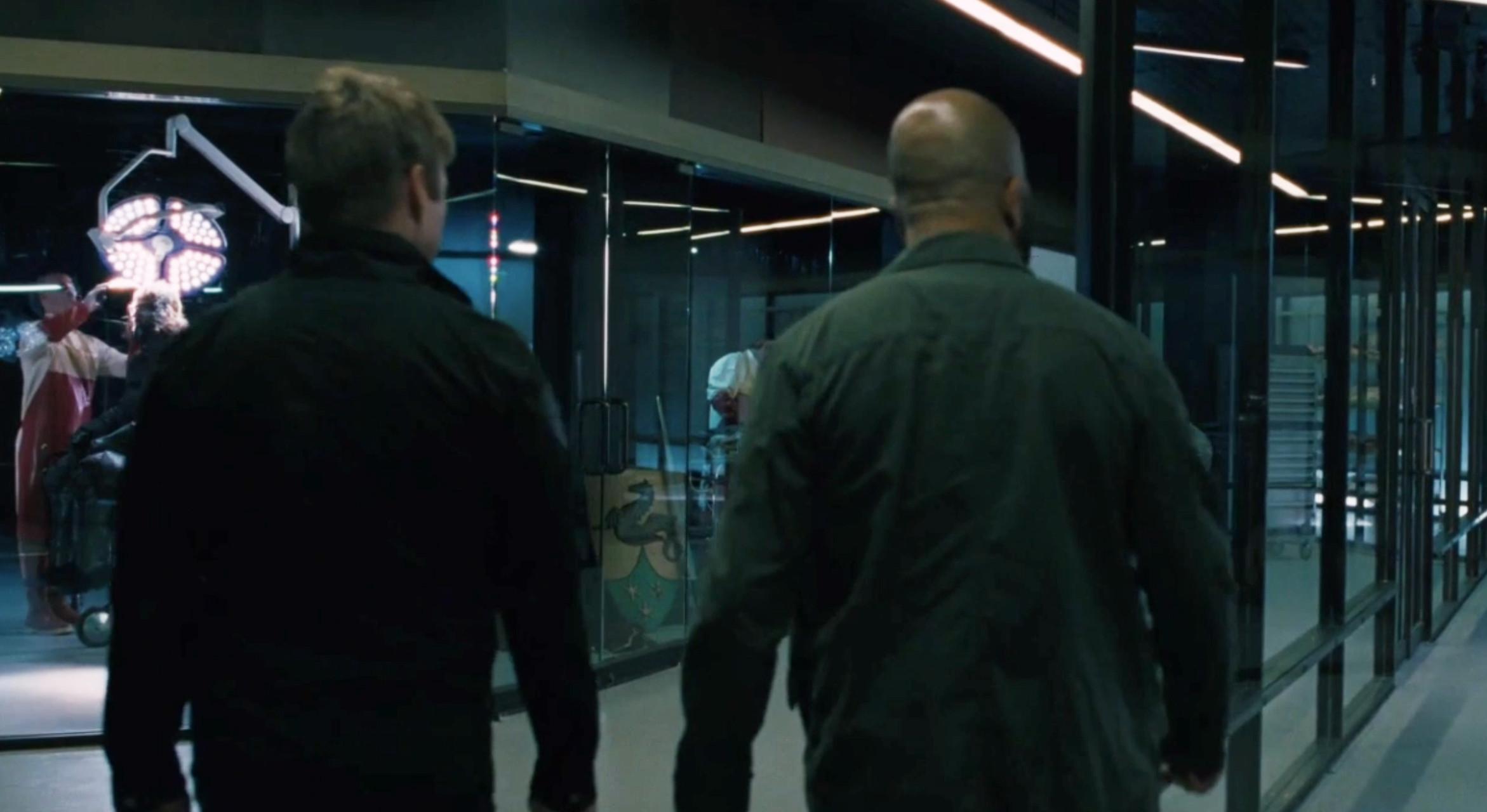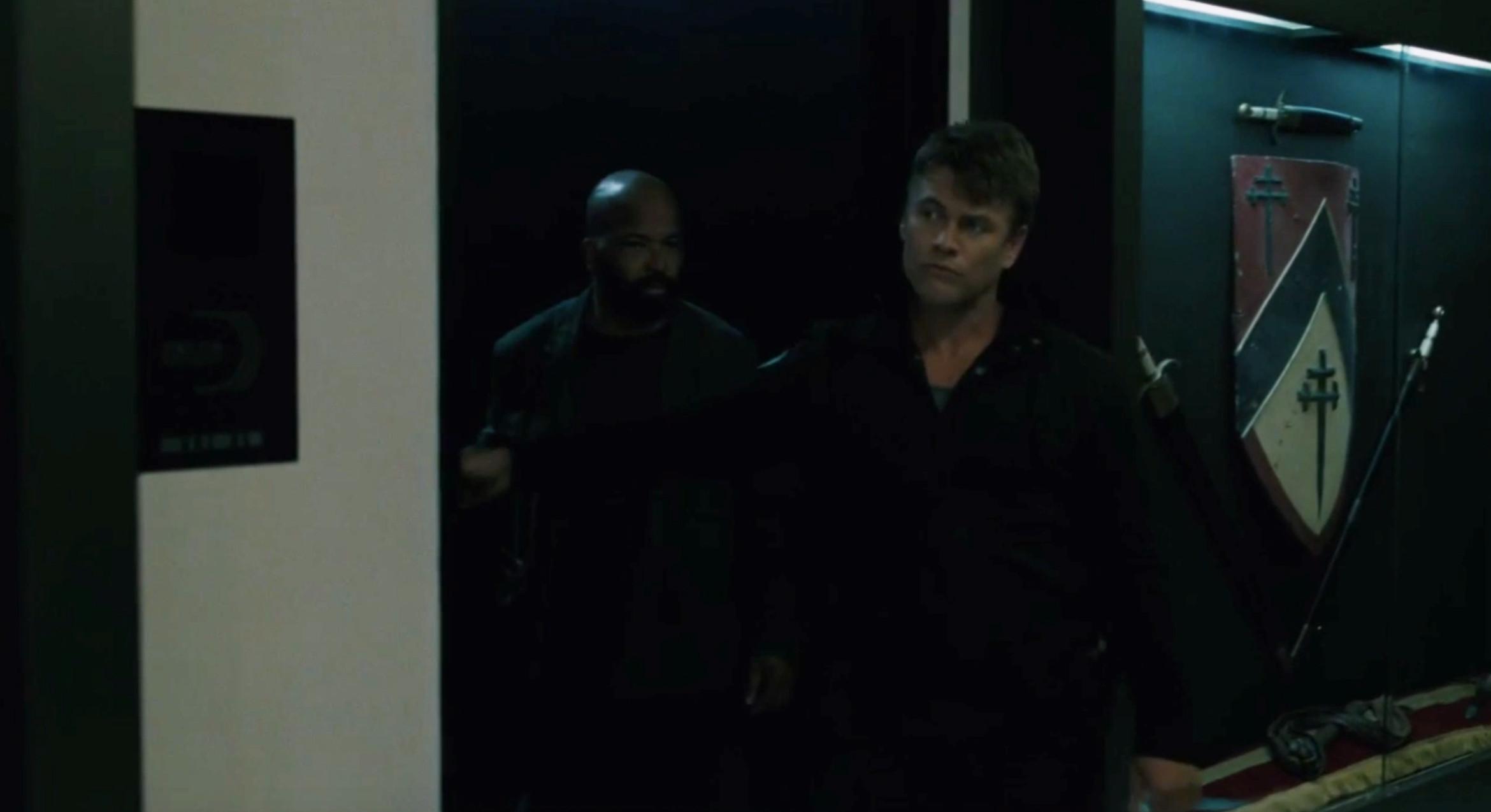 This scene begins when Luke Hemsworth—who’s apparently super jacked?—and Bernard come around a corner as the latter asks, “What are we doing in Park Four? I thought the parks were shut down,” which may not make sense even if you watch Westworld. It seems that this is some kind of Games of Thronesian park—at the very least, it’s medieval themed. There’s a shield with some swords behind Hemsworth (screenshots brightened for clarity):