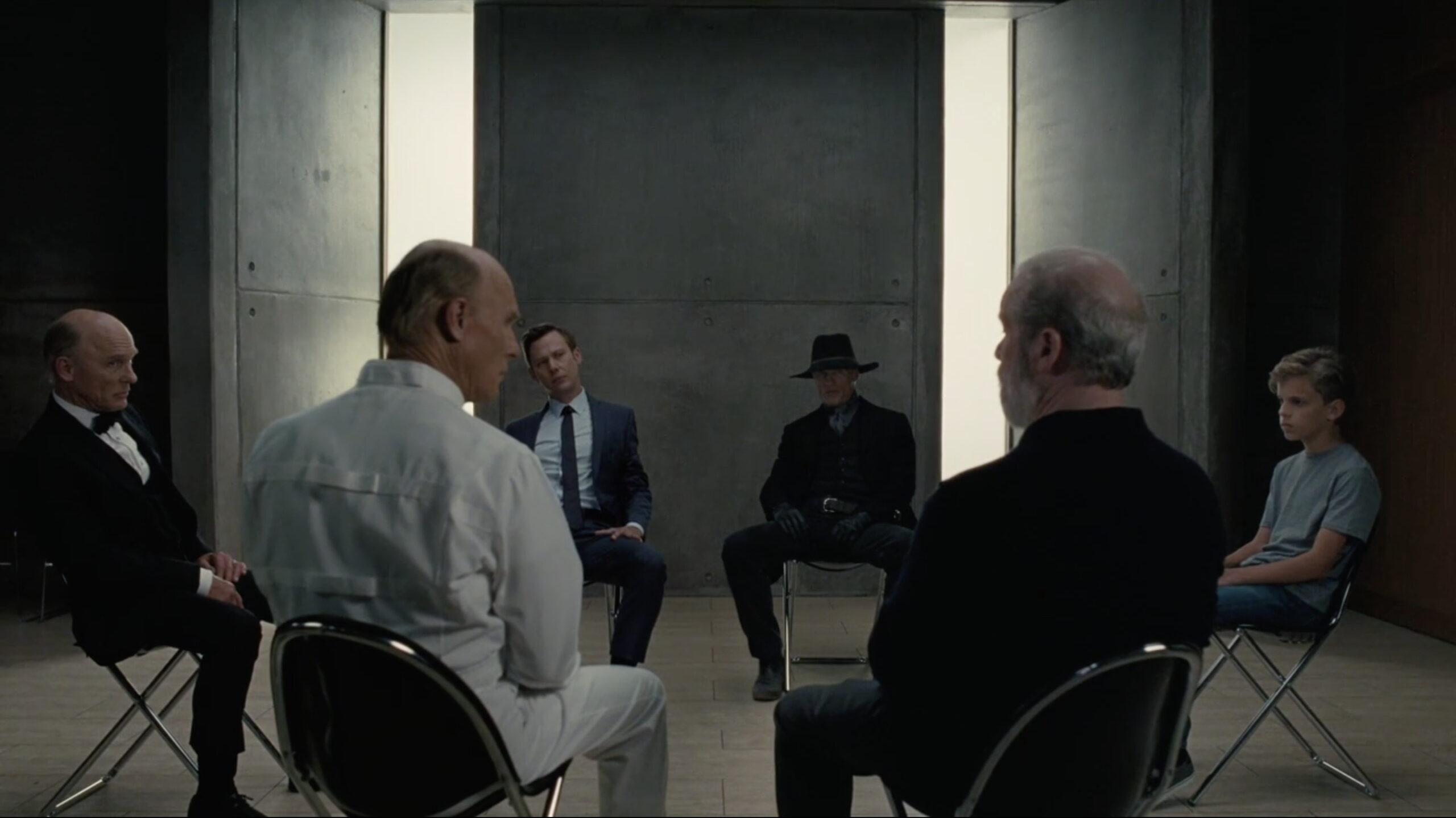 William begins to panic and attempts to break free when a vision leads him back to his troubled childhood, and then he nearly bites off a worker’s finger before being sedated. He’s awoken by Craddock, the Westworld Confederado who William killed in past lifetimes, who then leads him to another group therapy session. But when he enters the room, he sees the group includes different versions of himself spanning across his lifetime, and the session is being led by his stepfather, James Delos.