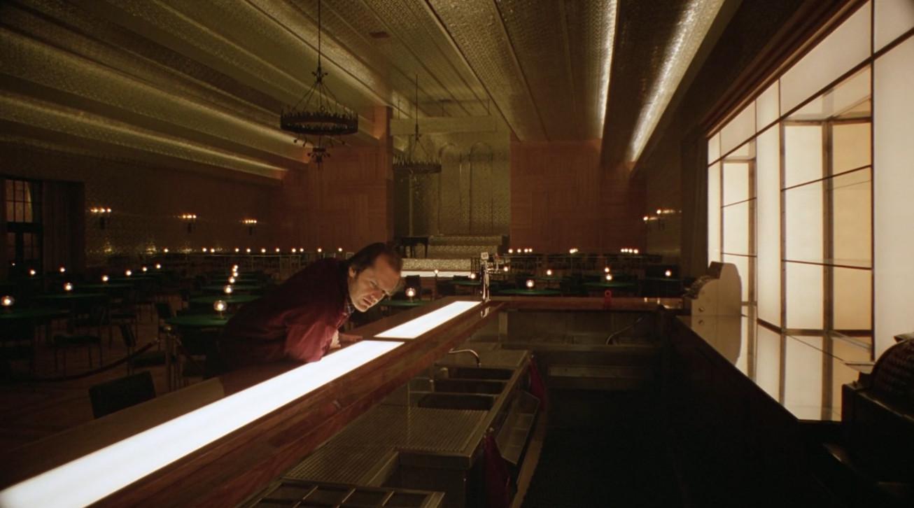 The camera cuts to a montage of Jack in the Overlook—sitting, blankly staring, standing at an empty bar, having conversations with people who aren’t there.