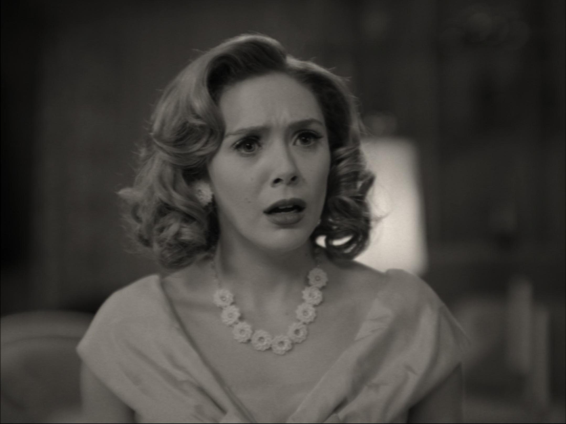 “So, where did you two move from? What brought you here, how long have you been married, and why don’t you have children yet?” Mrs. Hart asks in a rapid-fire series of questions, earning some laughs from the studio audience. Wanda and Vision both begin to stumble in their responses, and Mr. Hart starts pressing the confused couple to answer the questions—and then he starts to choke on his food. Wanda remains in a dazed state, the room starts to shake, some eerie Twilight Zone–style music cues in, and the camerawork quickly becomes more dynamic in its tracking. Mrs. Hart—laughing, for some reason—tells her husband to stop, but before long, she turns her attention to Wanda, almost pleading for her to “stop it” instead. Wanda eventually commands Vision to help Mr. Hart, and after Vision phases through his boss’s neck to yank out the food, the camera returns to its normal state, and Mr. and Mrs. Hart act as if nothing happened.