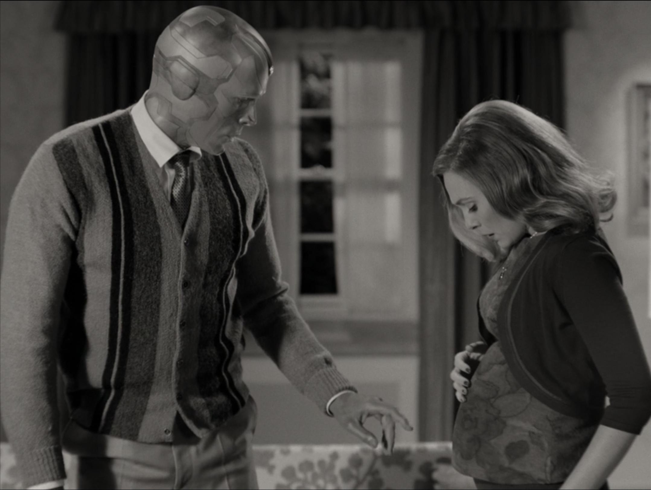 At the end of the second episode, just before the black-and-white sitcom world of WandaVision turns to color at last, Wanda very suddenly becomes pregnant. Now, naturally, there are a lot of questions here. The first one being, well, Vision is a robot … so, how does that work? Does Vision even have a penis? (Sorry, this is probably not the image you wanted in your mind and there are surely children watching this show. Paul Bettany claims it’s purple, though, in case you were wondering.) As The Ringer’s Charles Holmes recently wrote, Wanda and Vision’s romantic relationship has a long, complicated history in the comics. In the 1970s, Avengers writer Steve Englehart told fan magazine FOOM, “It’s always been my opinion that the Vision could not be a natural father.”