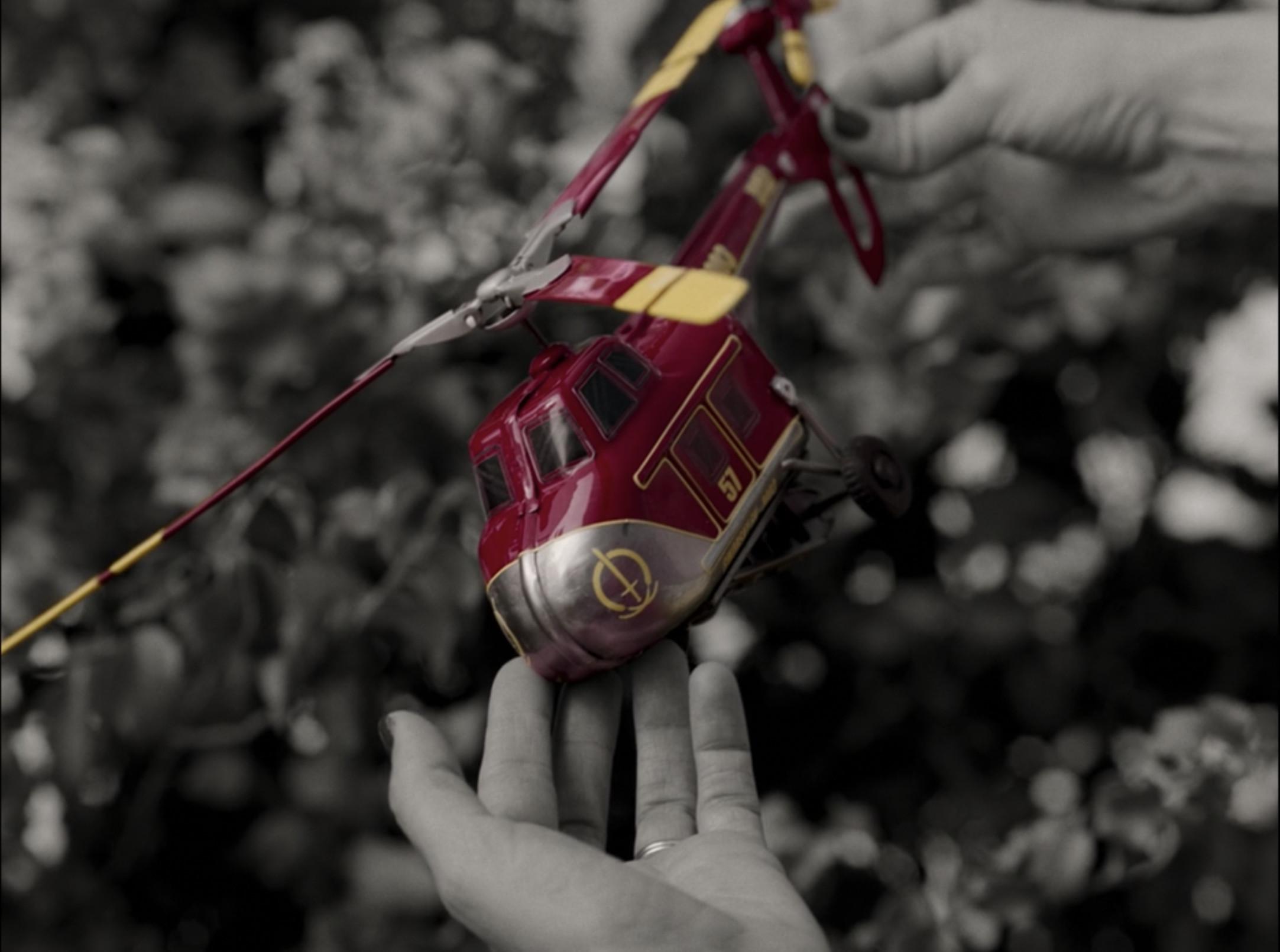 Instances like the dinner scene begin to appear more frequently in Episode 2. Early in the episode, Wanda hears a loud thud in the front yard, and finds a curious item lodged in a bush: a red-and-yellow toy helicopter with a sword symbol on it. The toy is the first instance of color in what was otherwise a black-and-white world, but before Wanda can figure out its nature or origin, Agnes arrives to depart with Wanda for a planning committee meeting for the town’s talent show.
